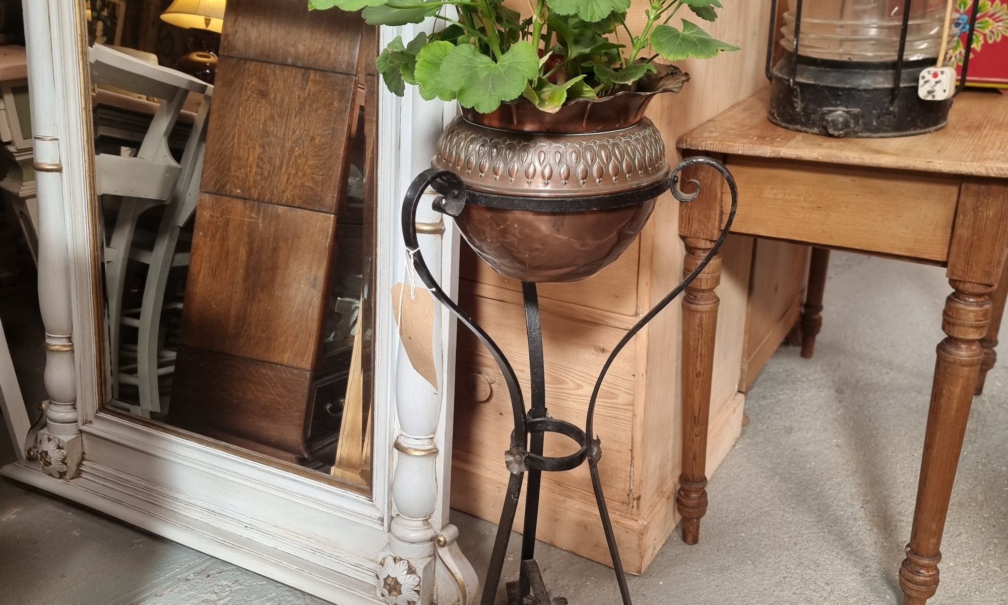 An Art Nouveau Copper Jardiniere on a wrought iron stand.