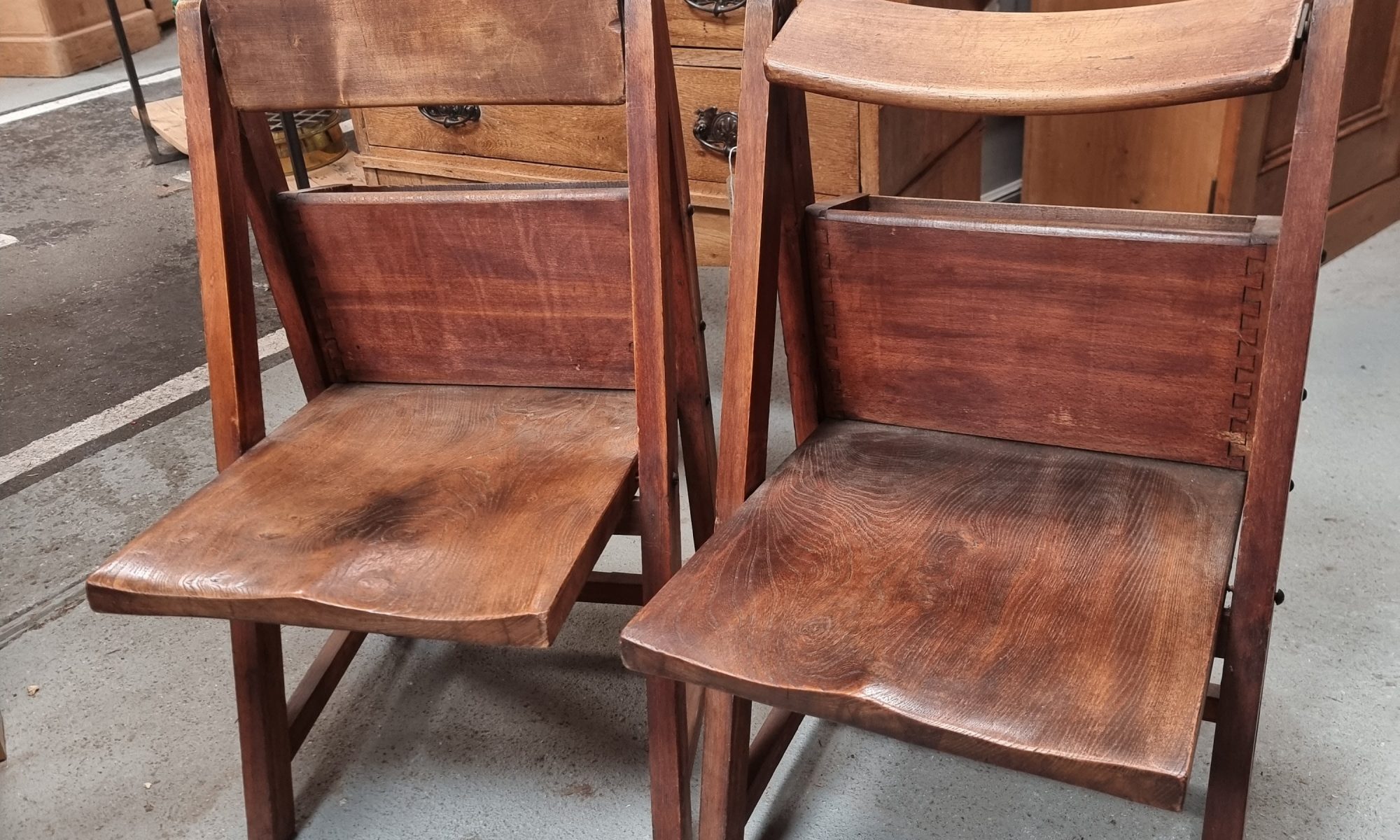 A pair of unusual oak and elm arts and crafts chairs with adjustable back rests and storage compartments.