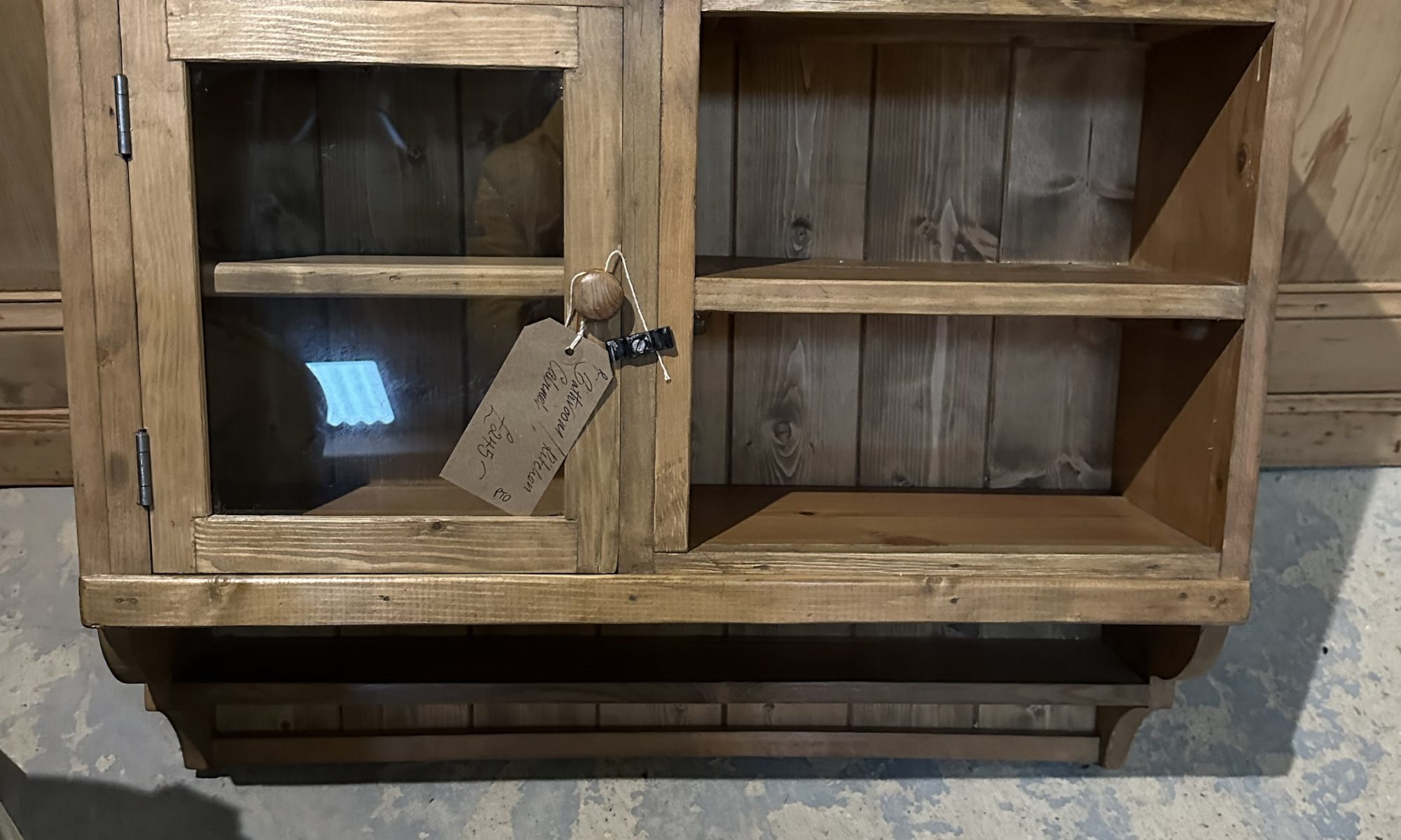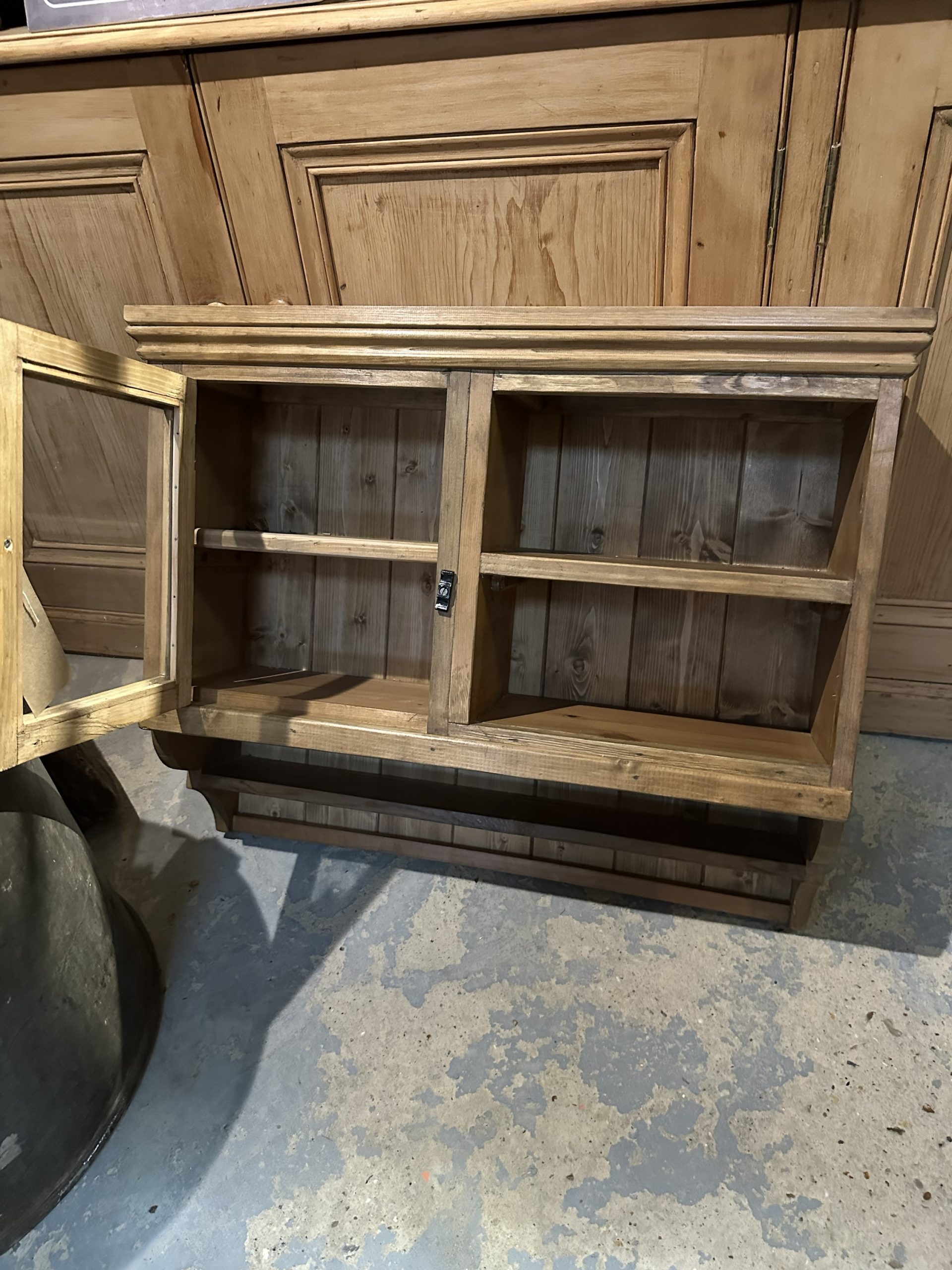 Product EnquiryPine bathroom/kitchen wall cabinet with open shelving to one side and more shelves behind a glazed door.