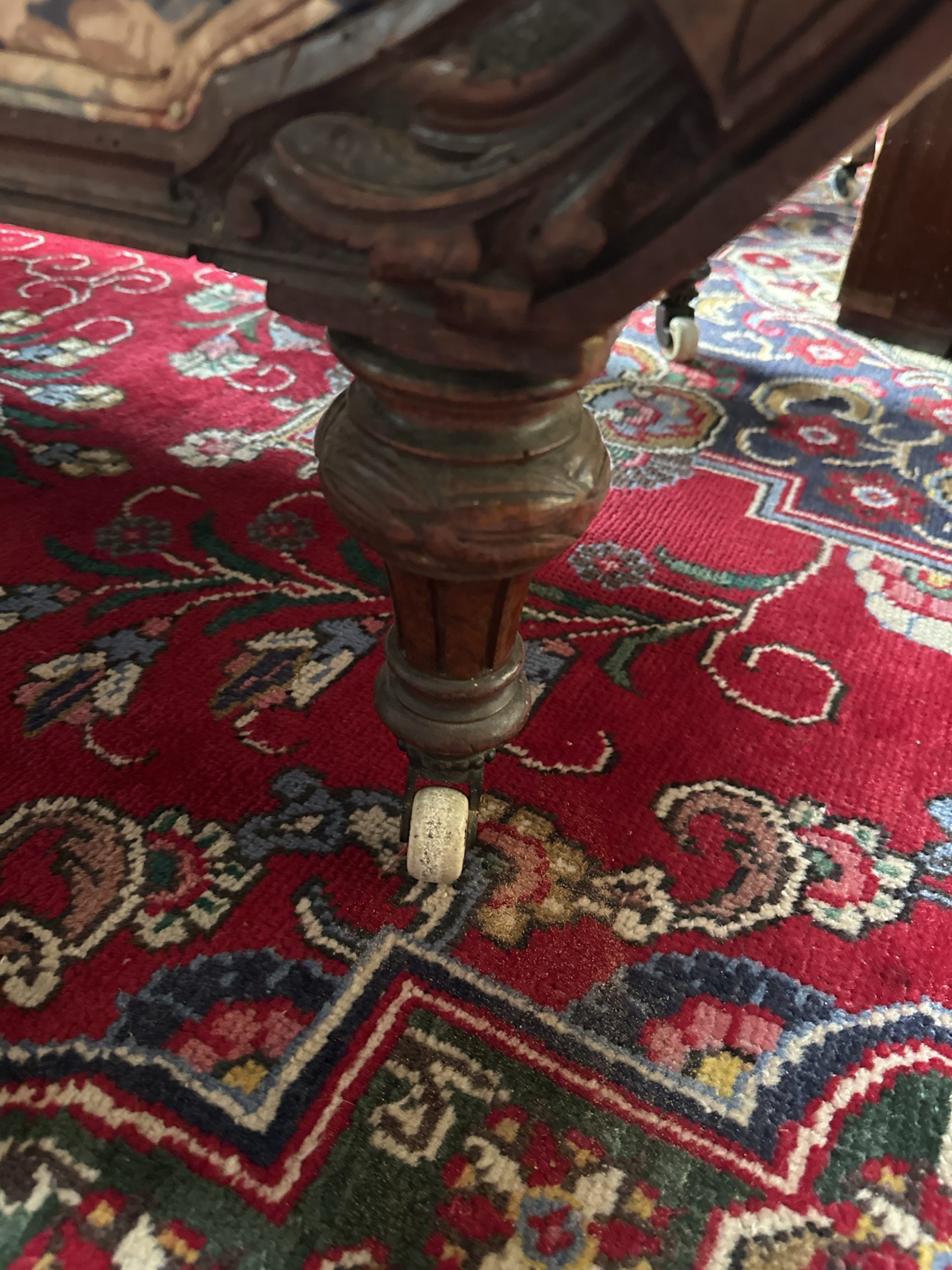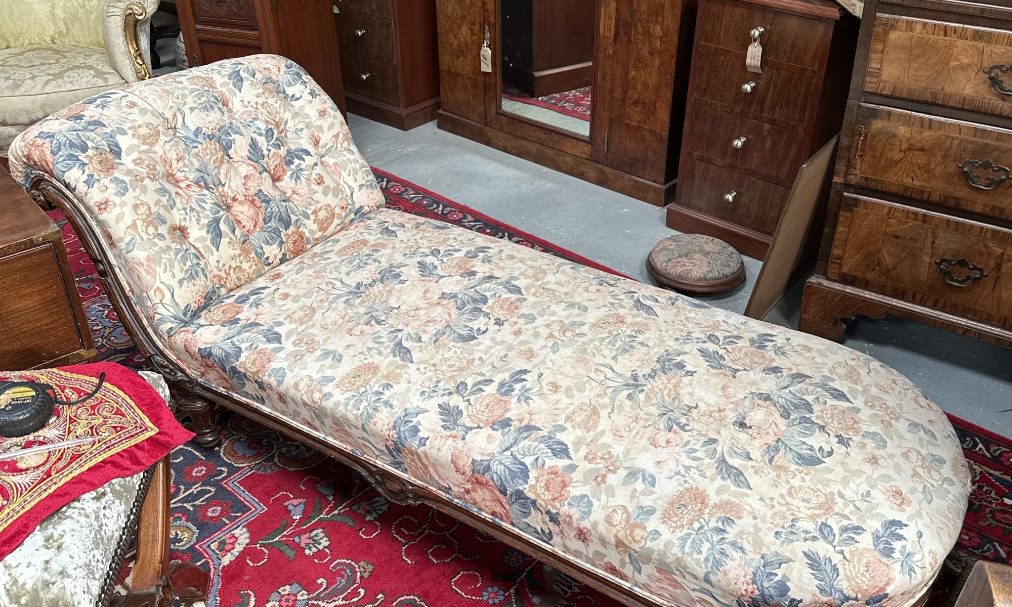Victorian, floral chaise longue. Original castors, material showing signs of wear, easily covered with throw.