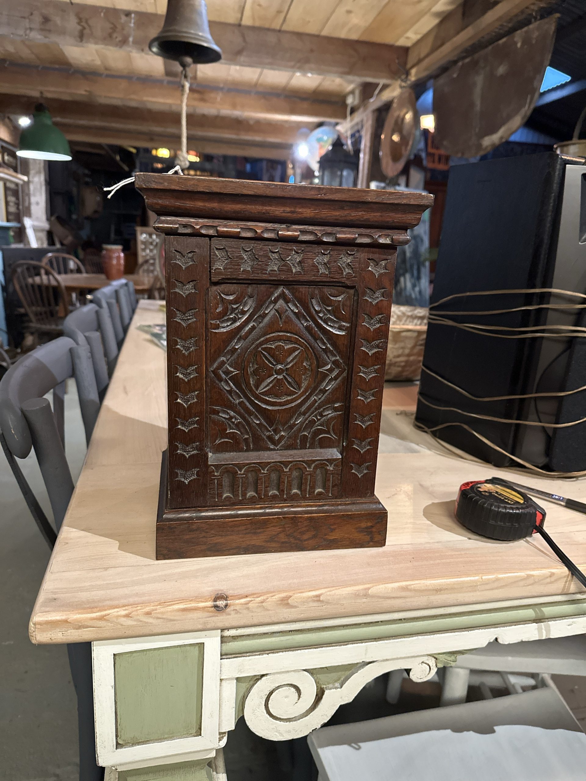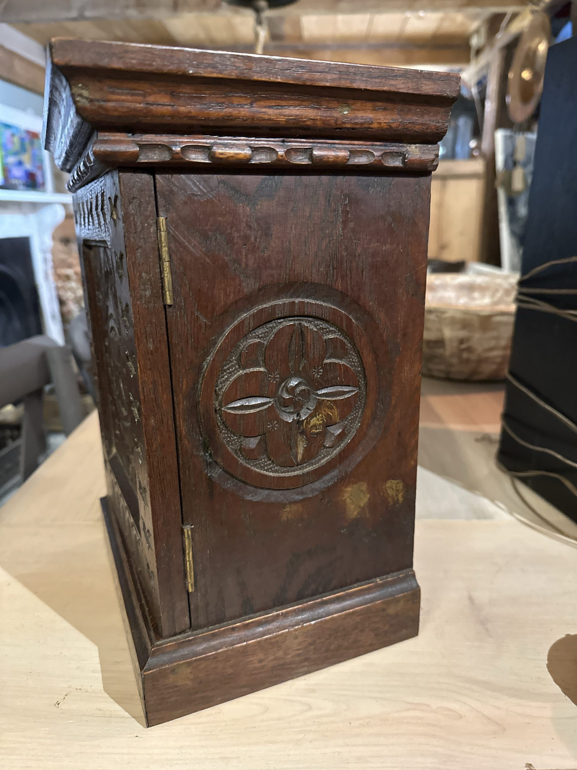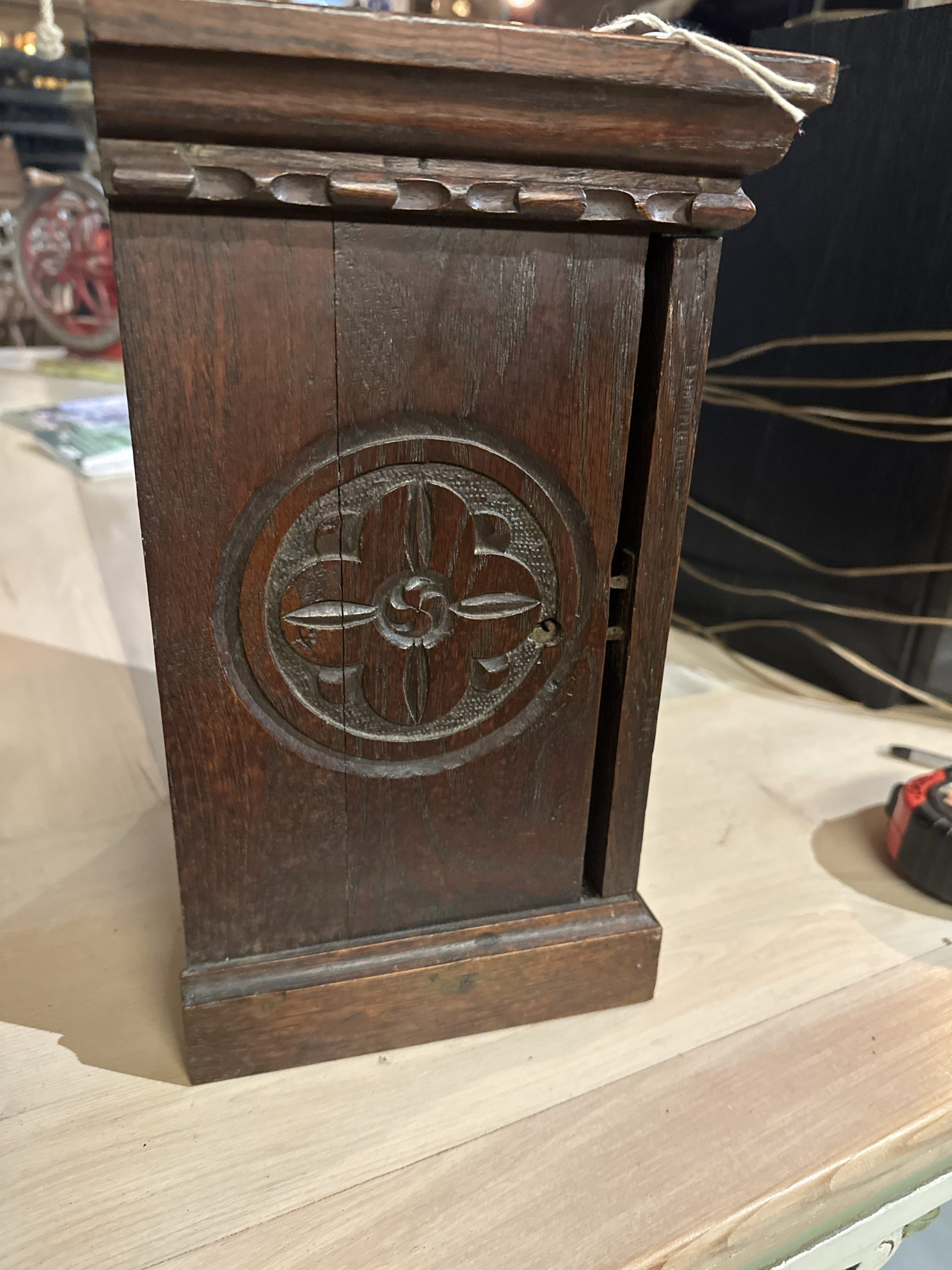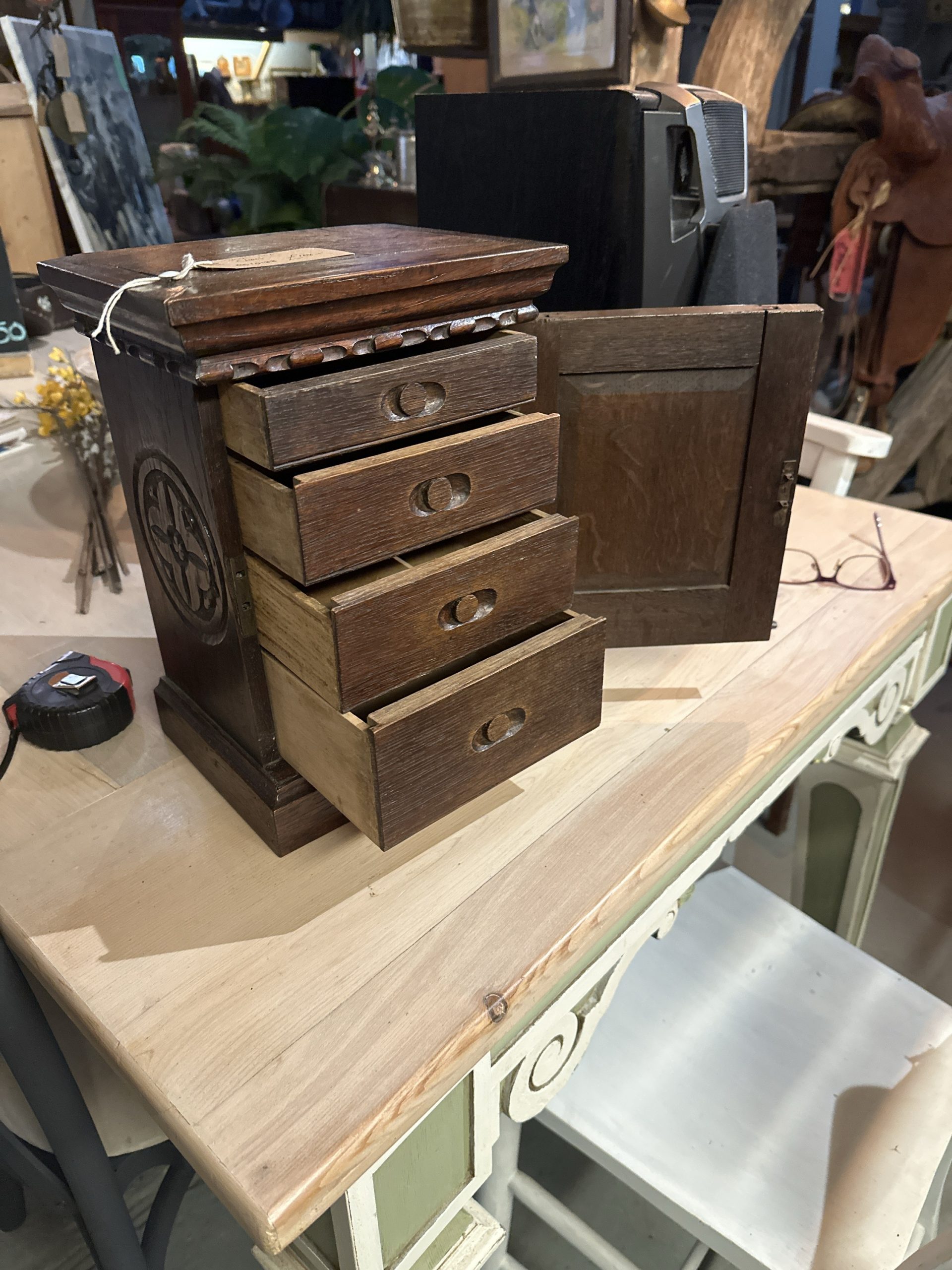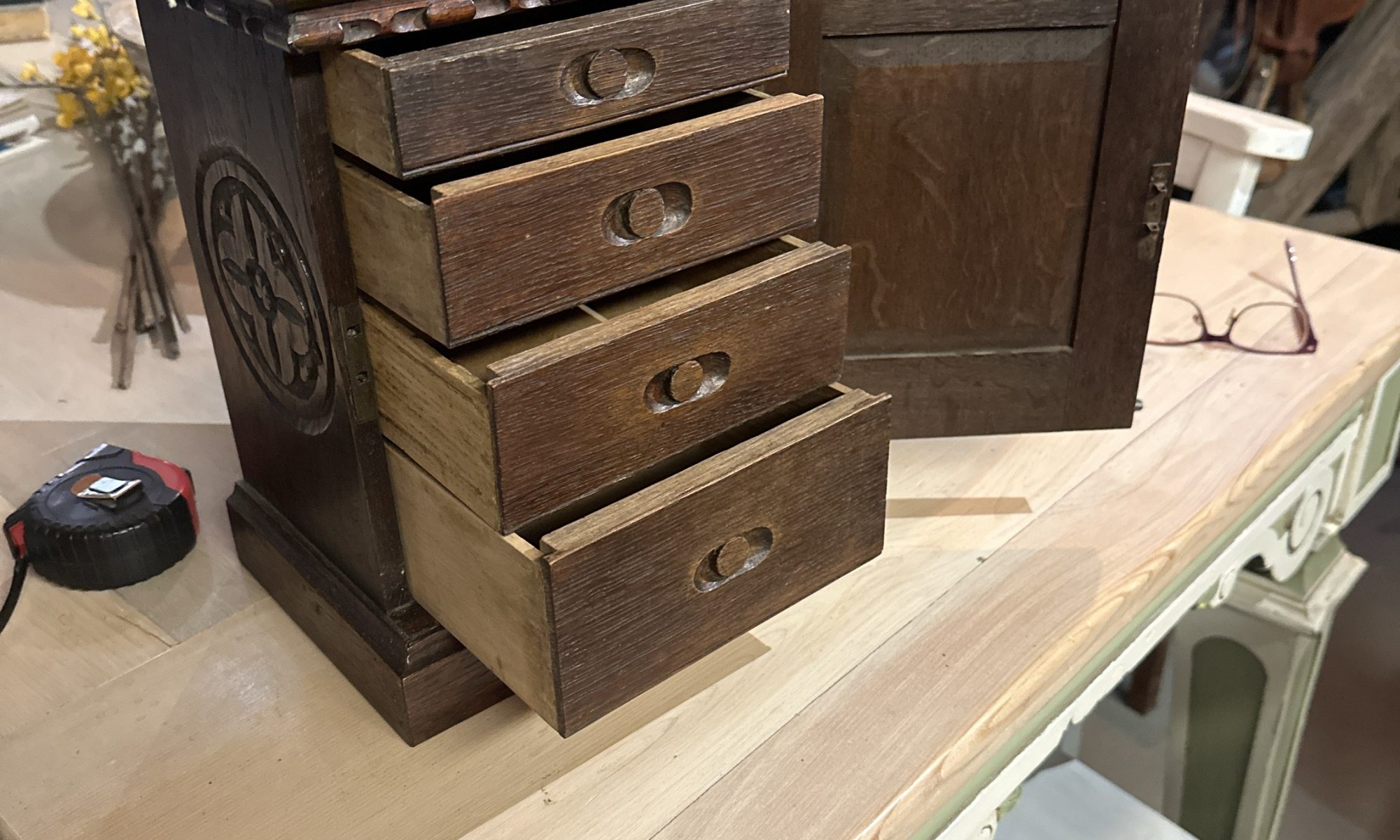 Carved sides and door with four mini drawers with carved knobs. Really unusual.