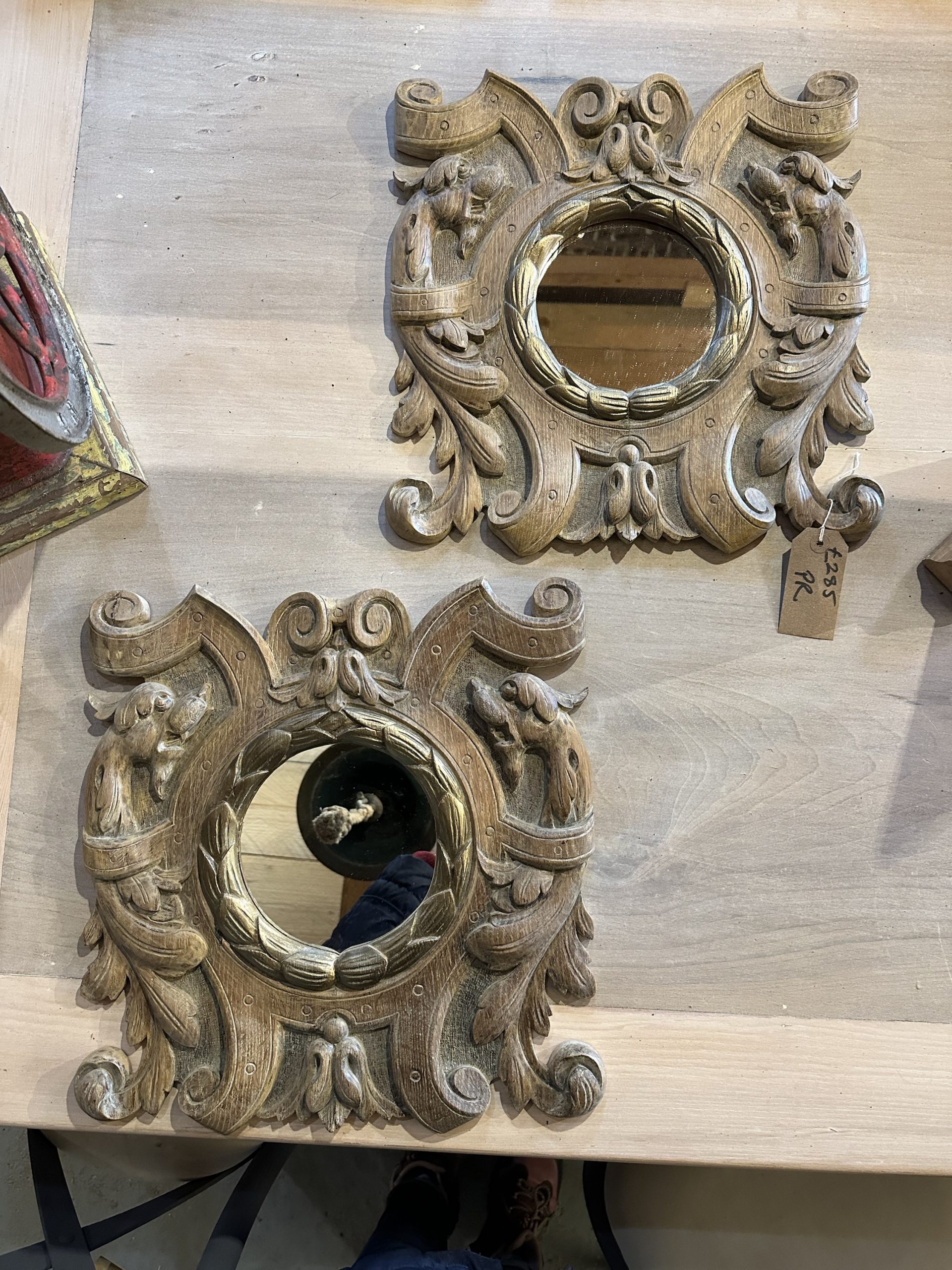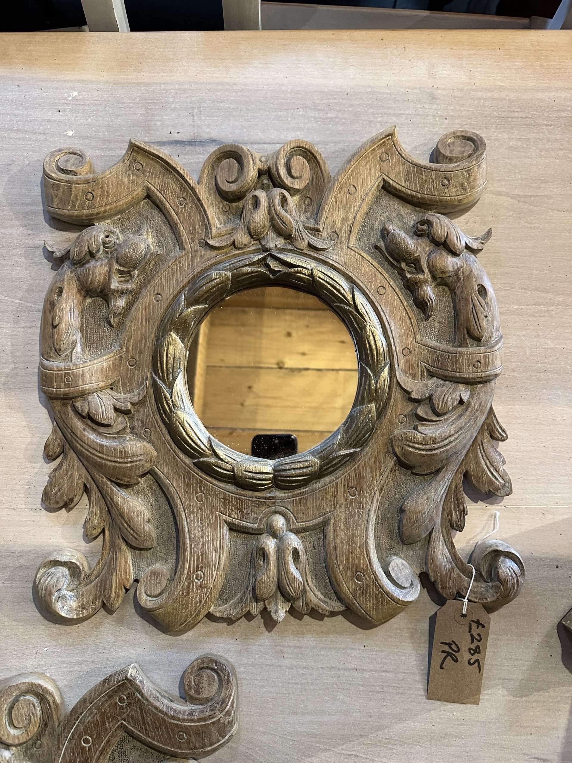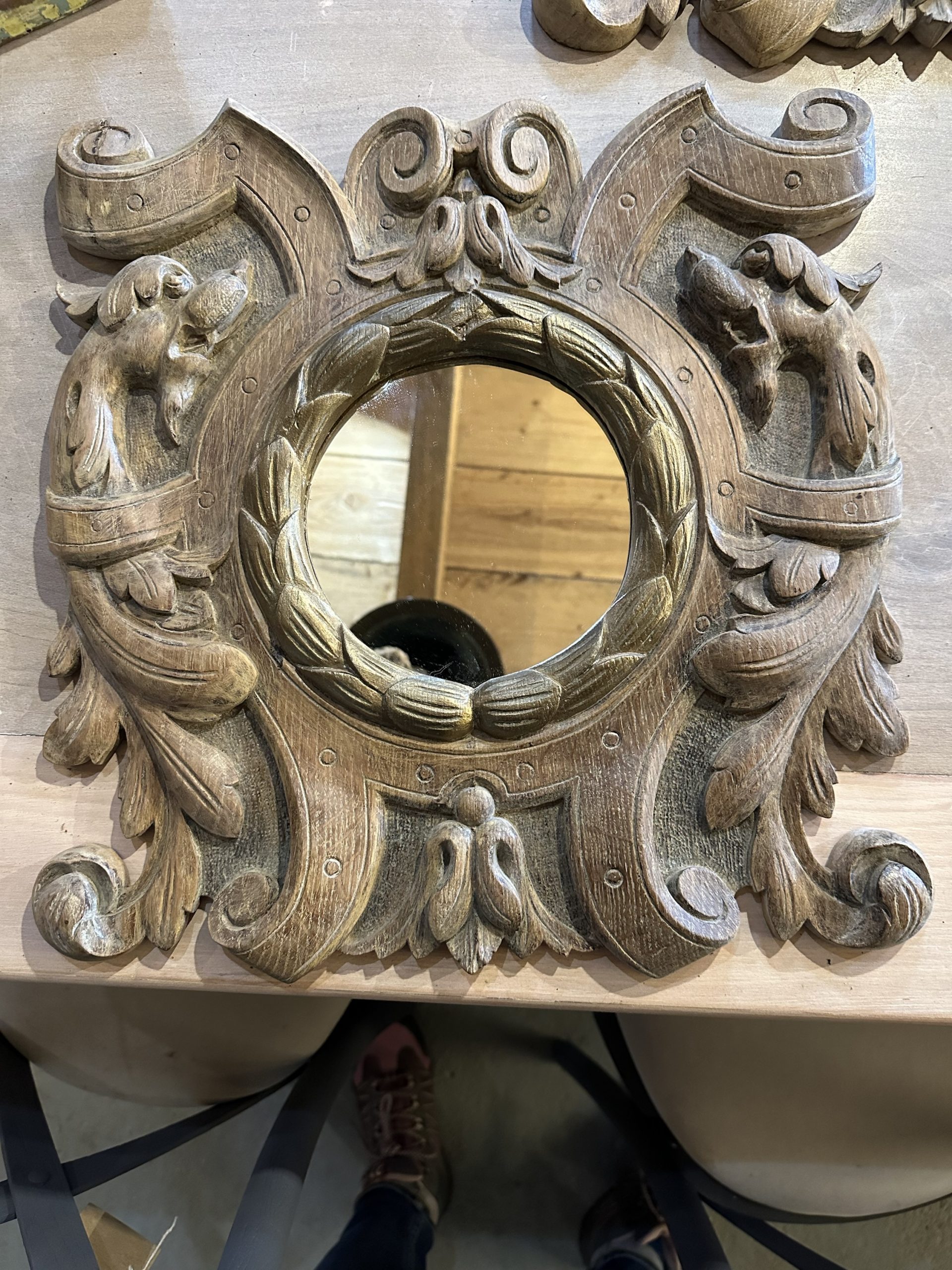Pair of carved oak mirrors with winged dogs or dragons depending on what you want them to be.