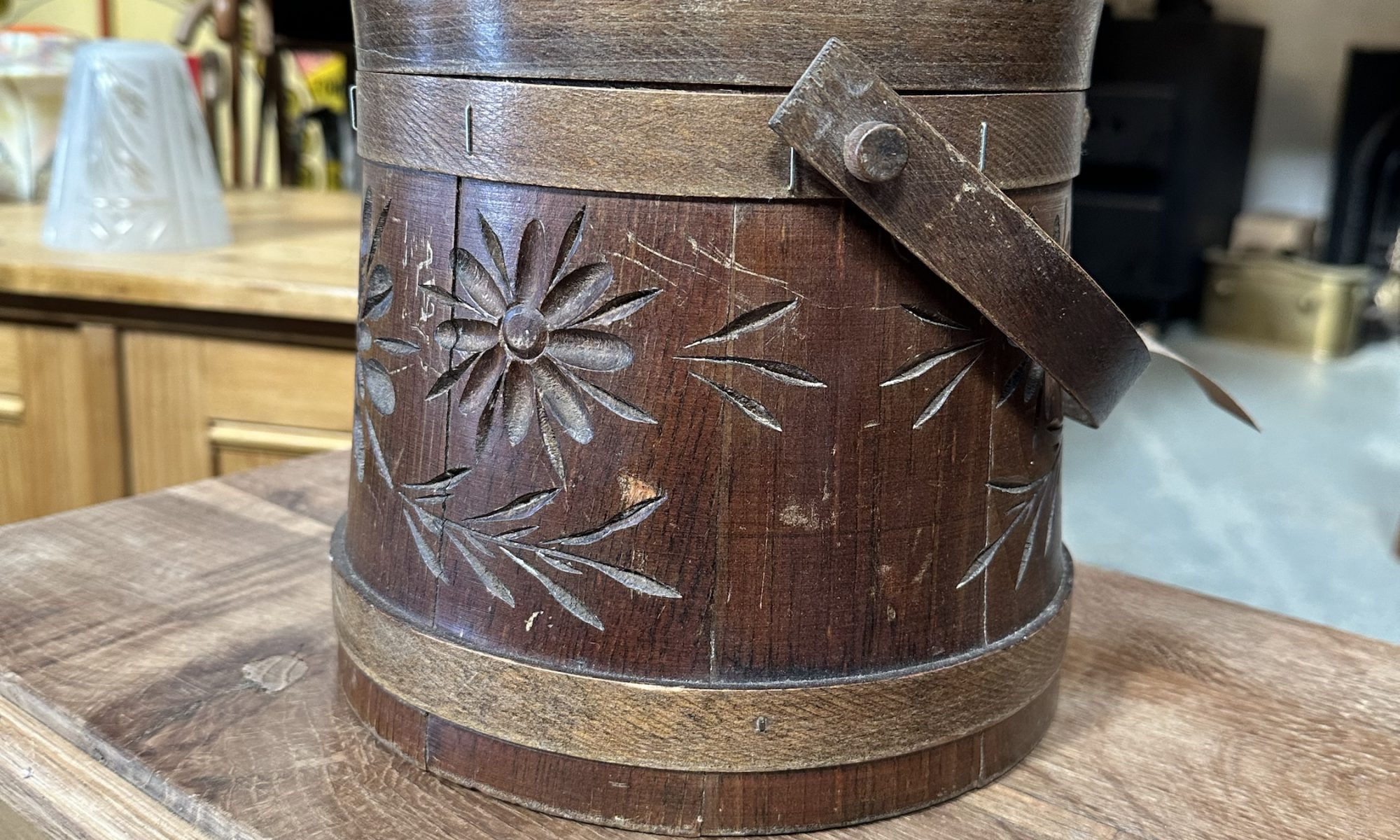 A really cute little firkin. A bucket with floral decoration to side and lid.