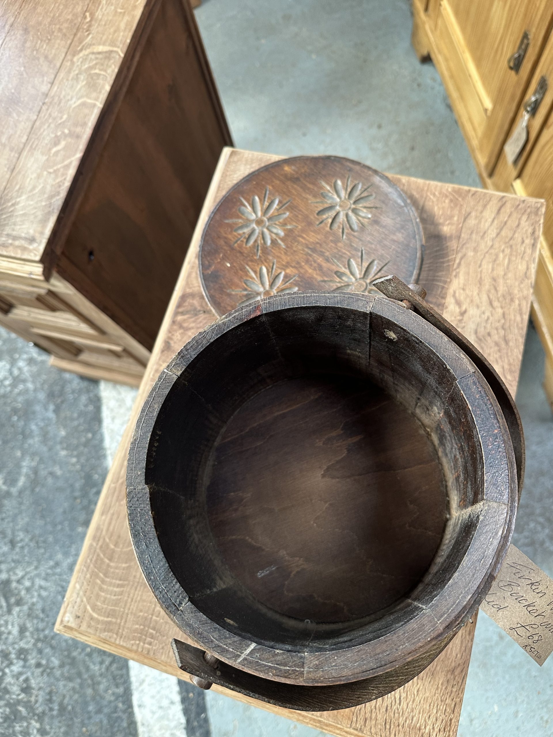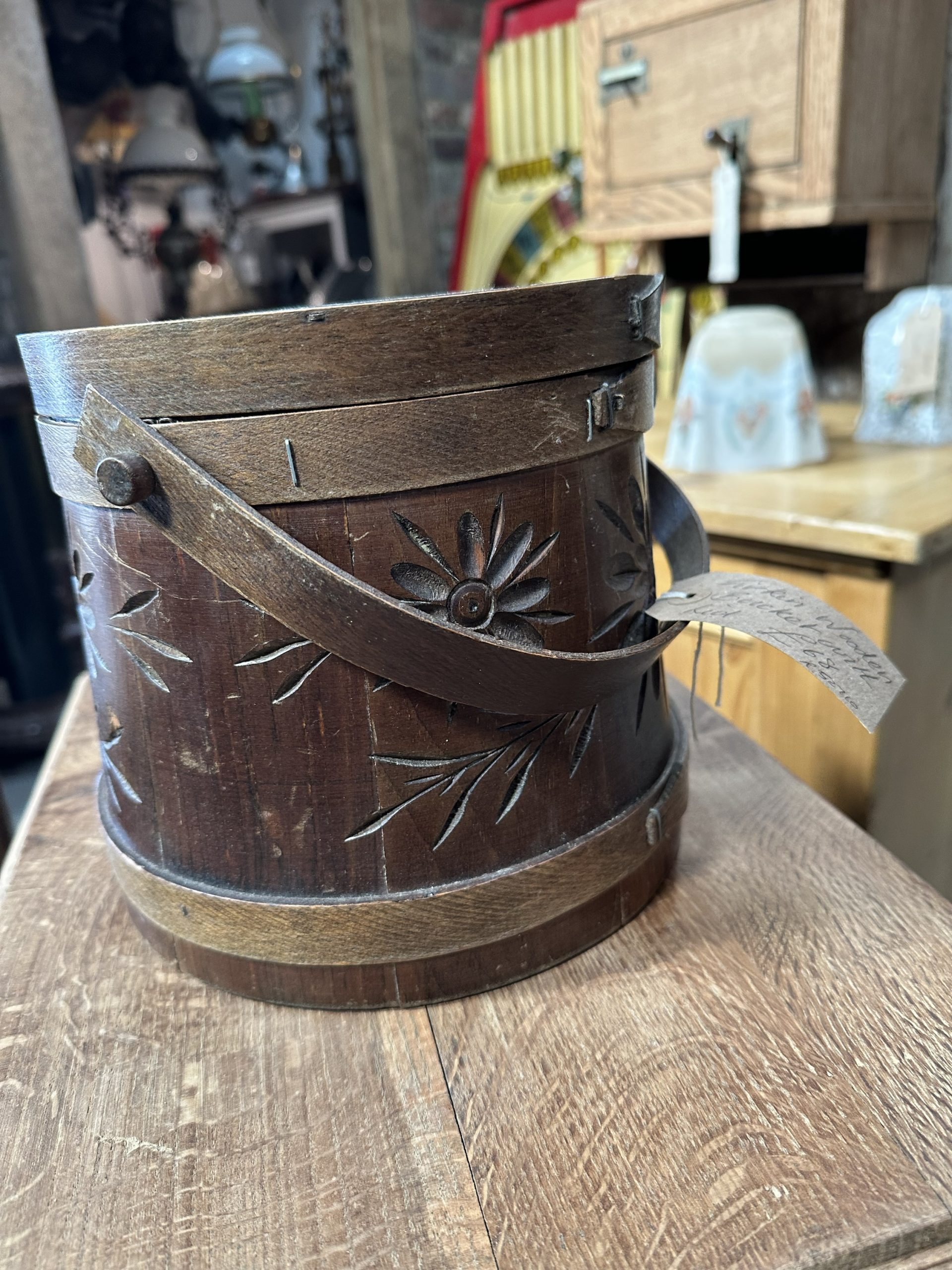 A really cute little firkin. A bucket with floral decoration to side and lid.