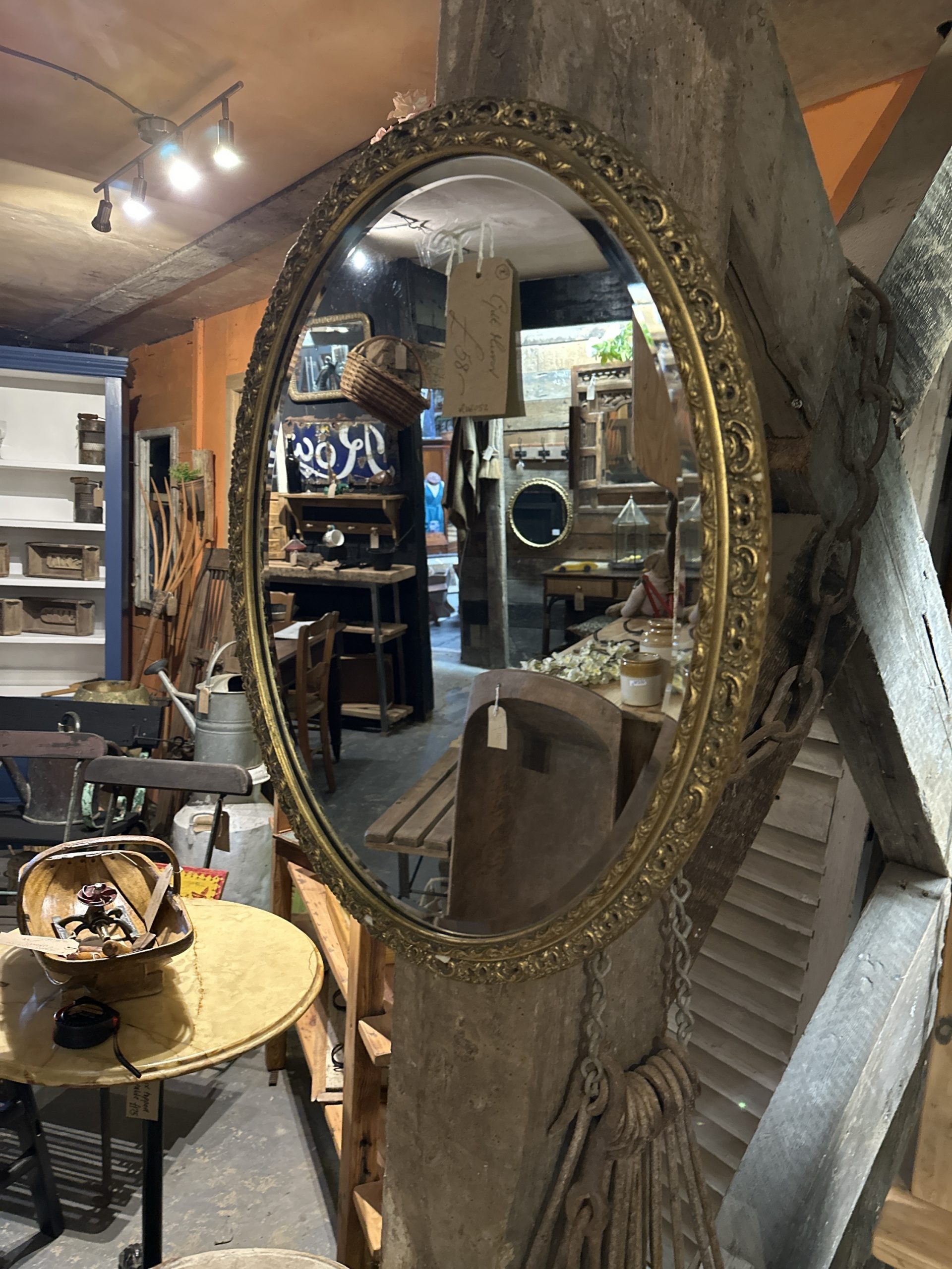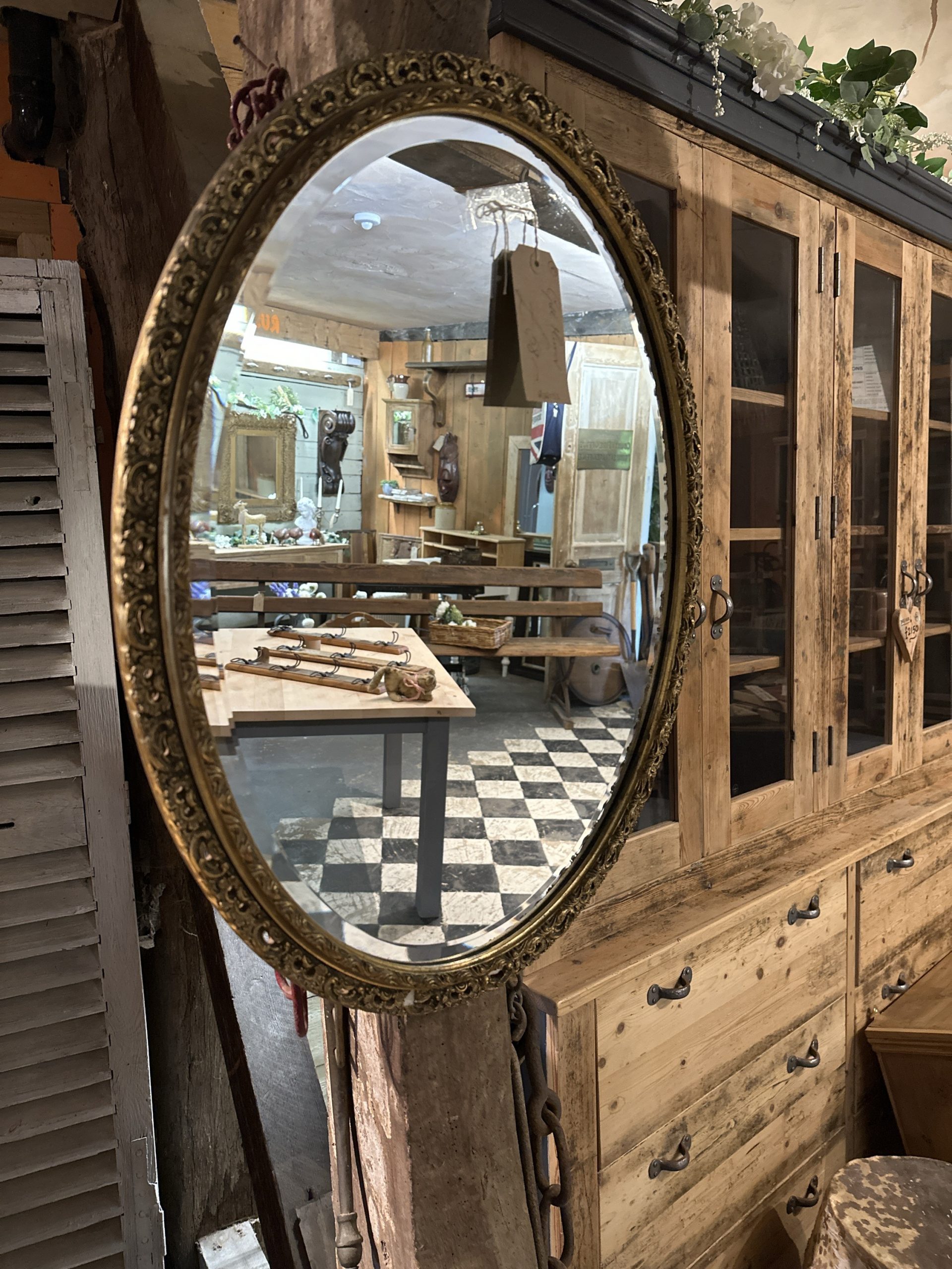 Oval, gilt framed bevelled mirror.