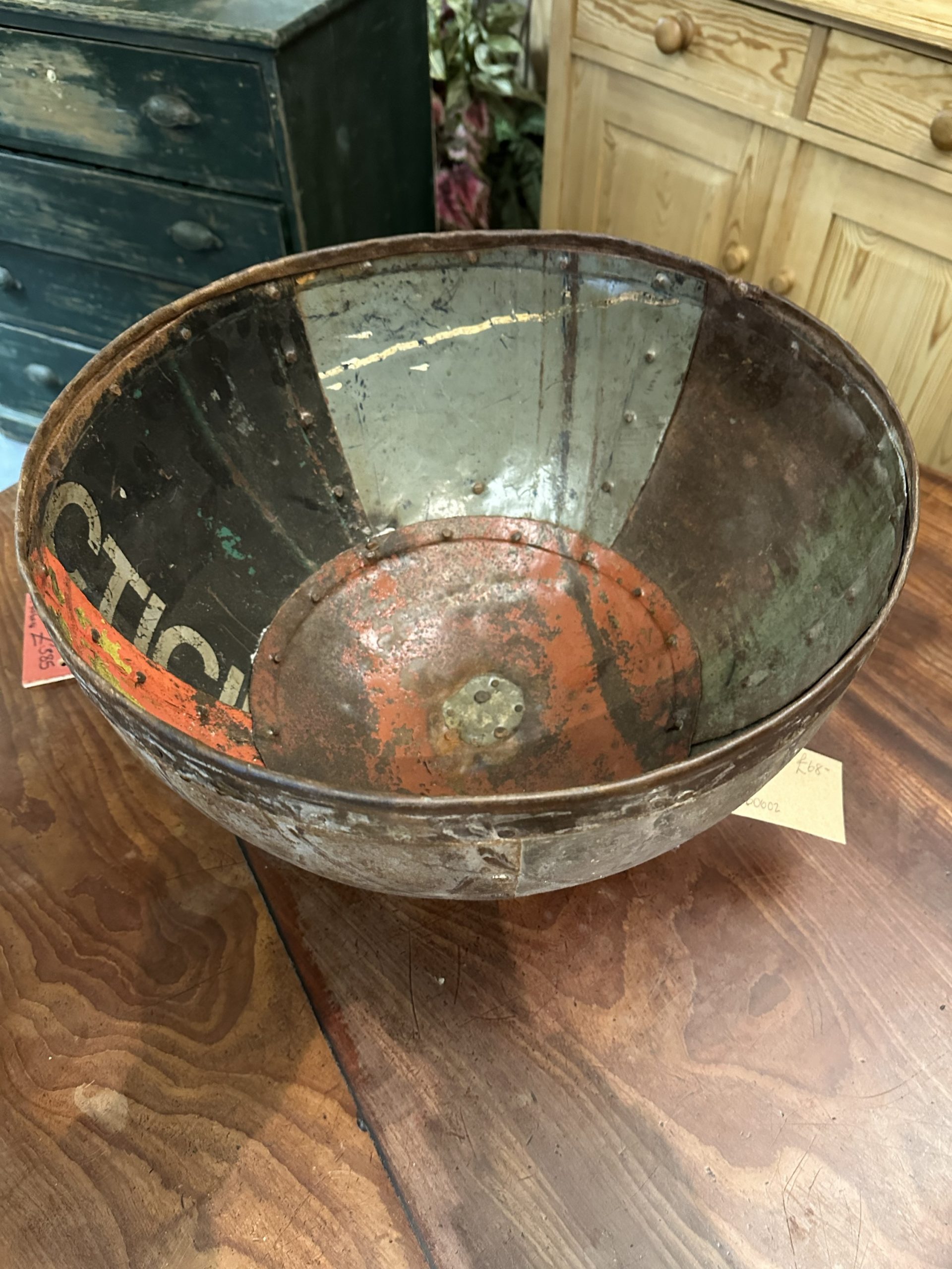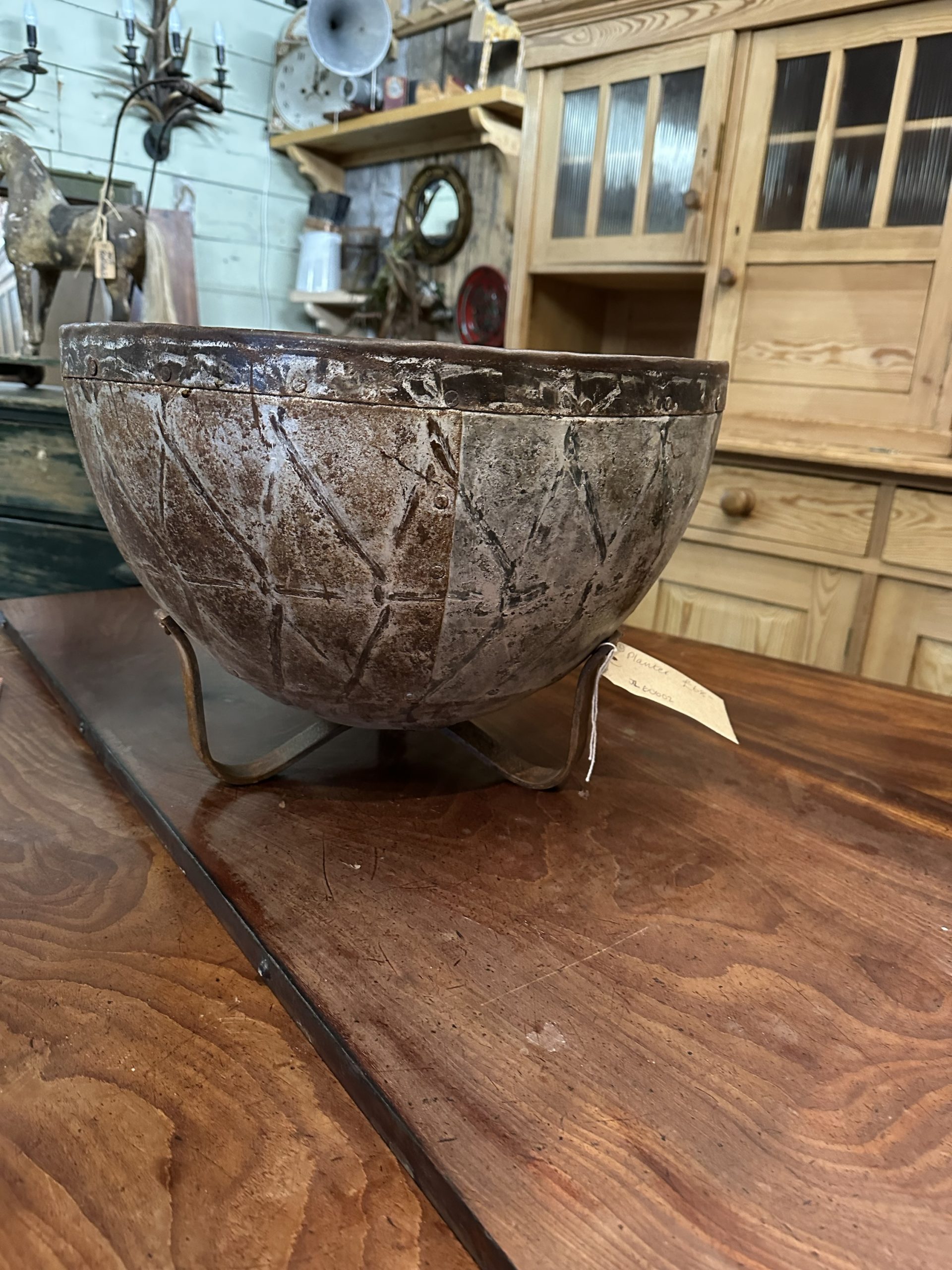 Heavy riveted metal planter. Could also be used as a fire pit.