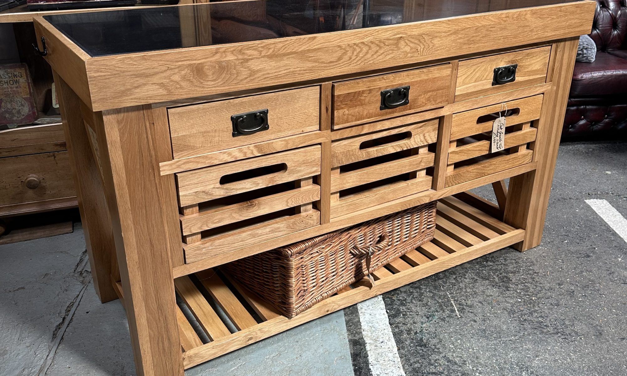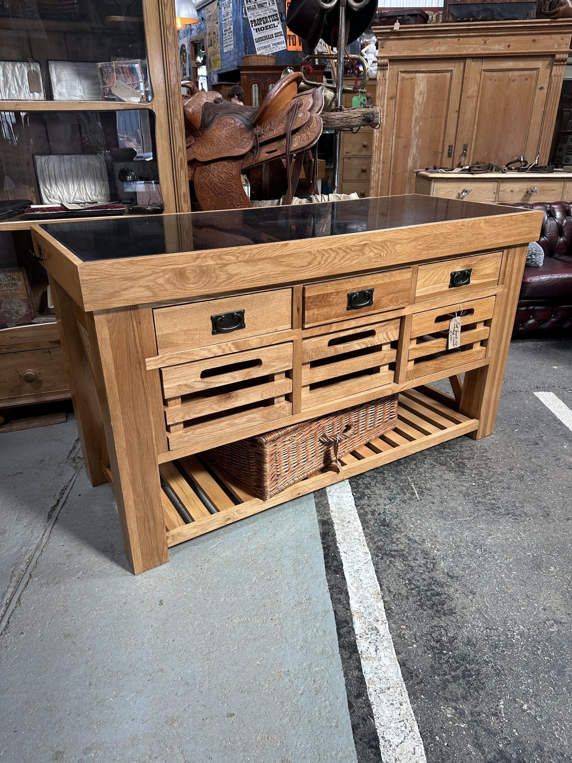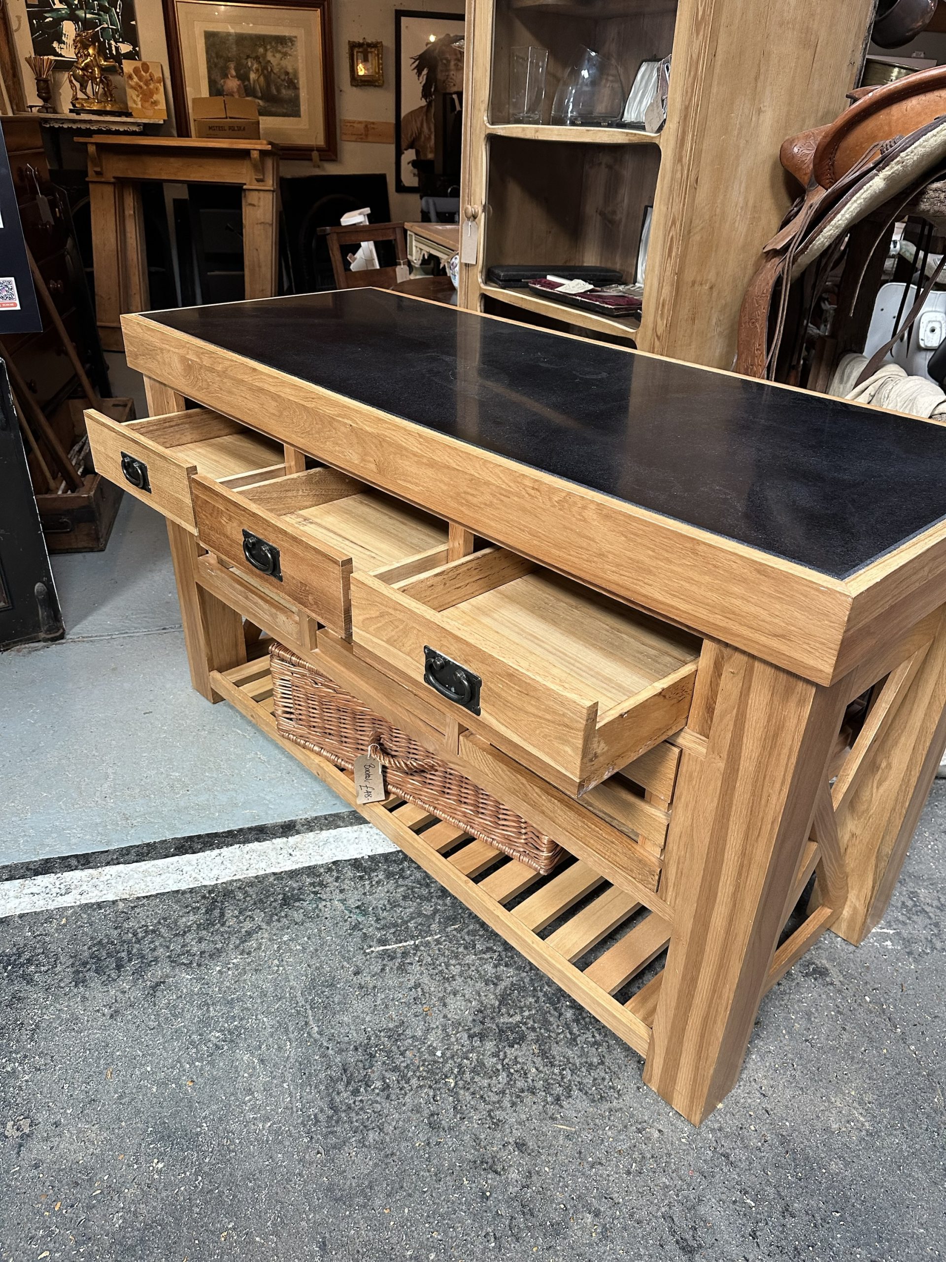 Oak, granite top kitchen island. Three enclosed long drawers over three long open drawers and slatted shelf at the base.