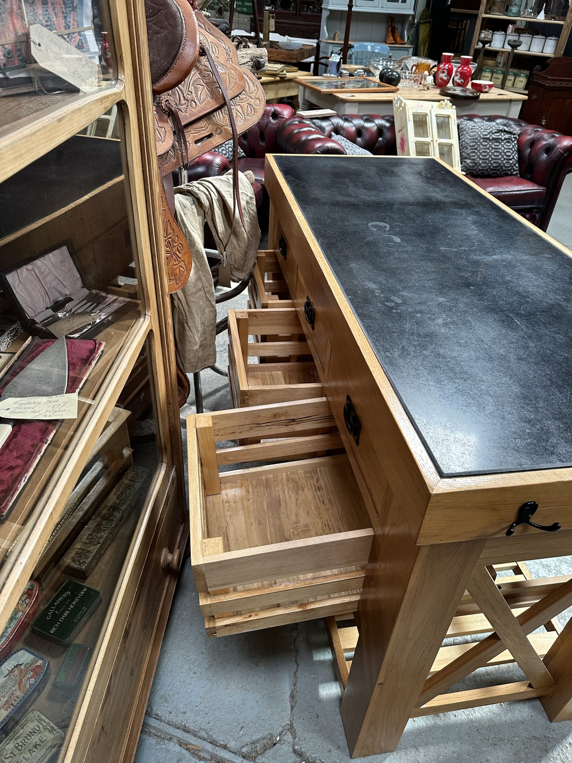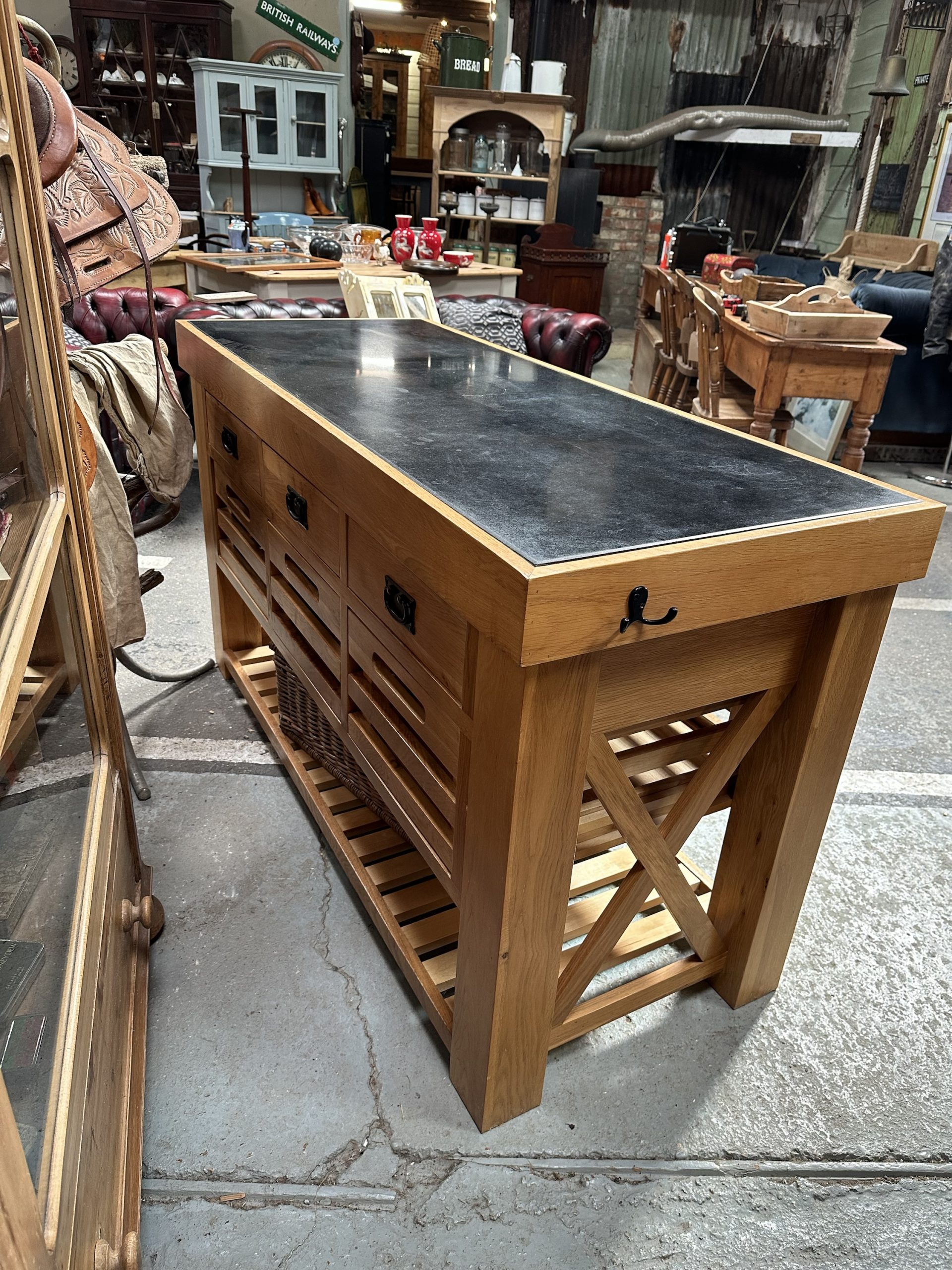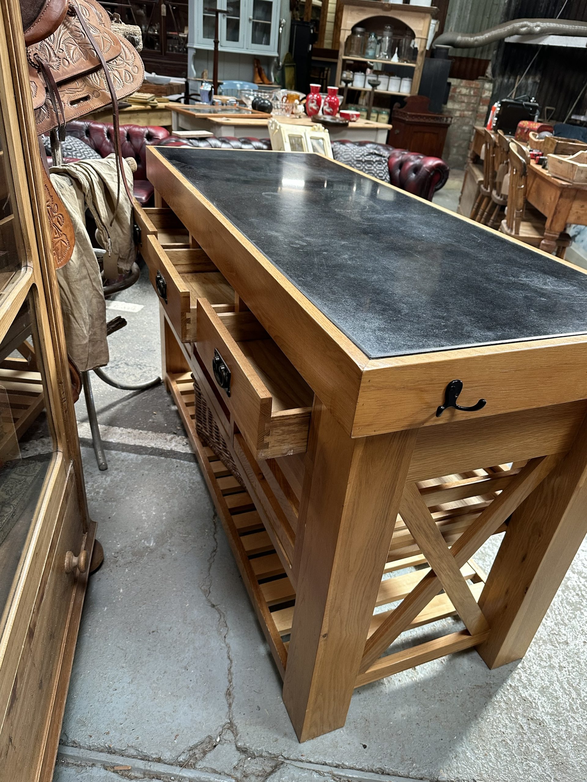 Oak, granite top kitchen island. Three enclosed long drawers over three long open drawers and slatted shelf at the base.