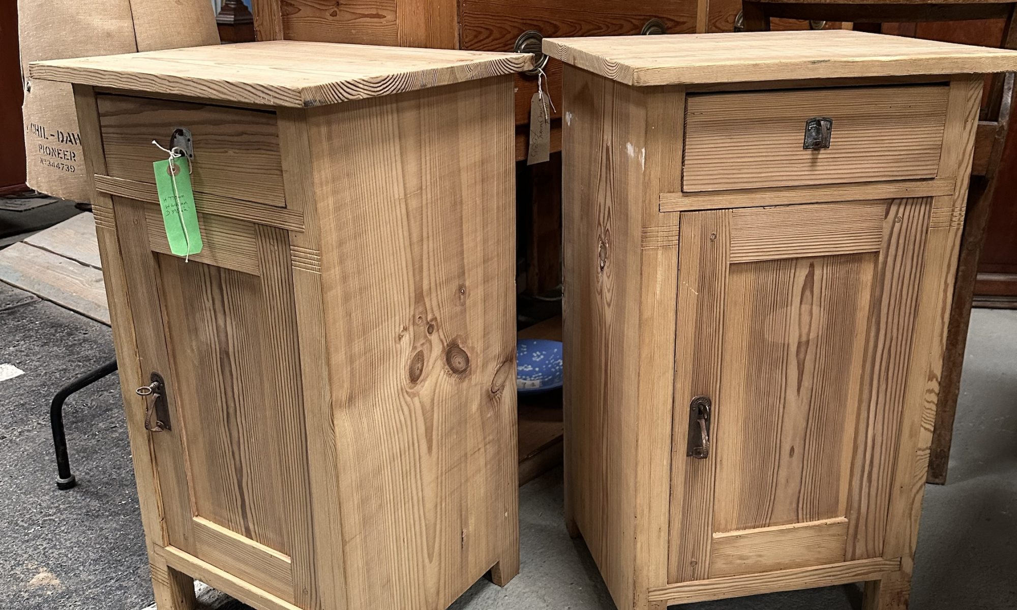 Product EnquiryA pair of old stripped pine beside tables with drawer and internal shelving. Both hinged to the right.