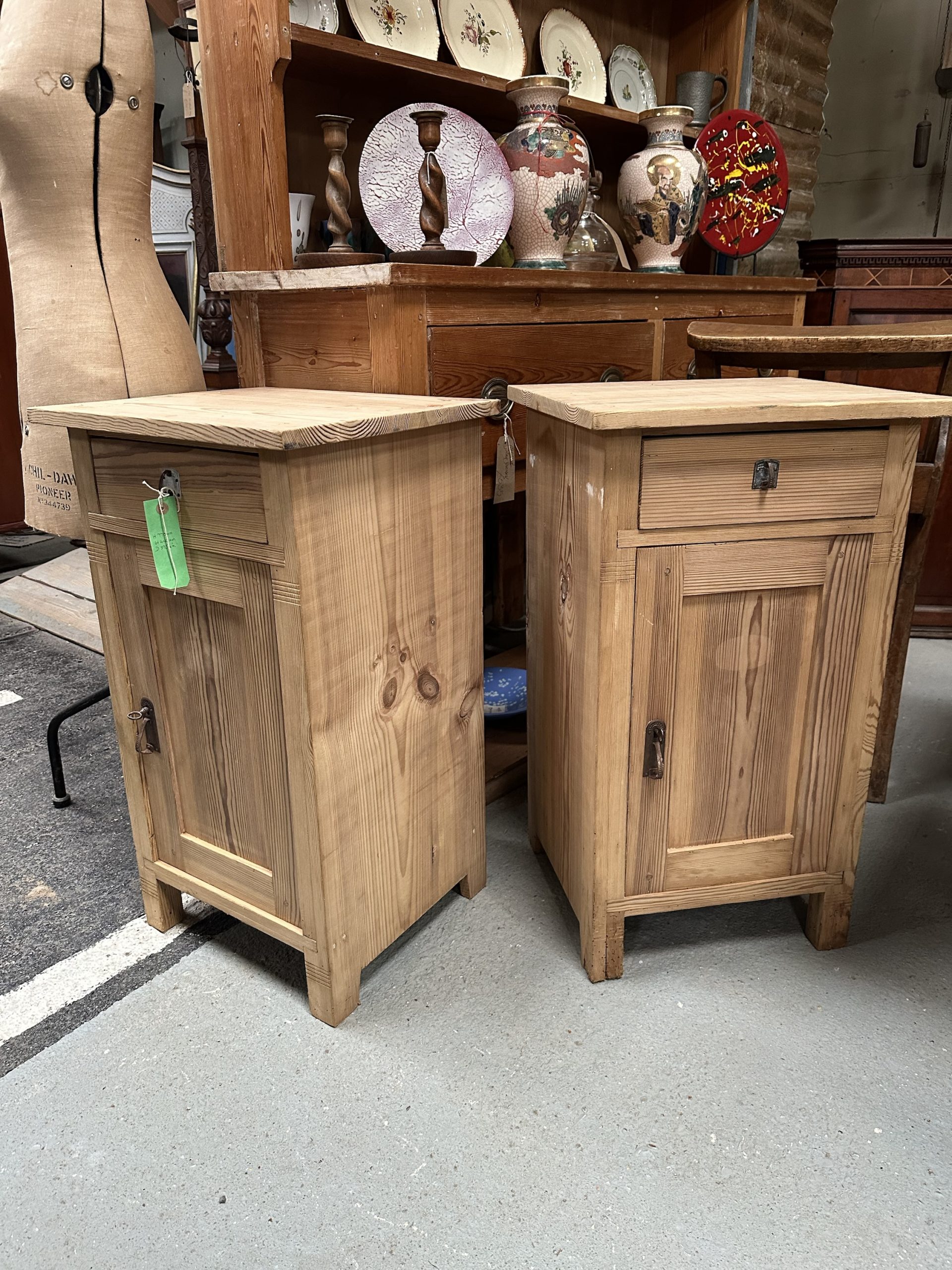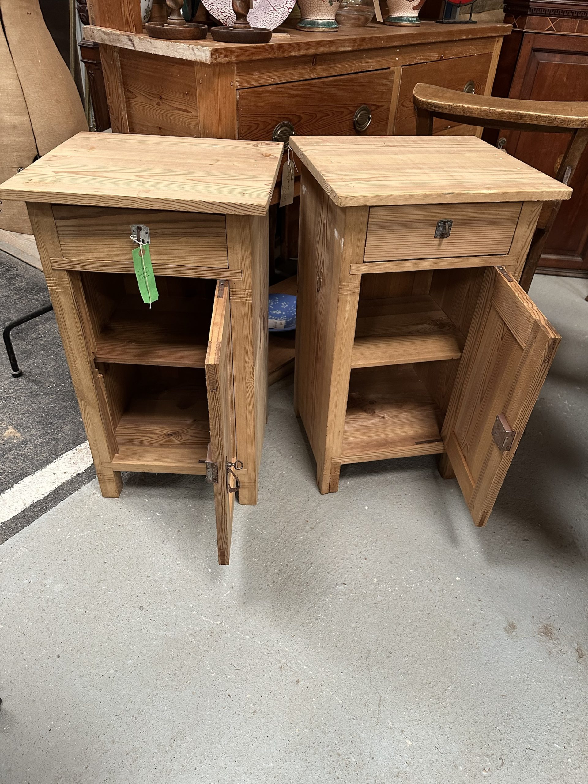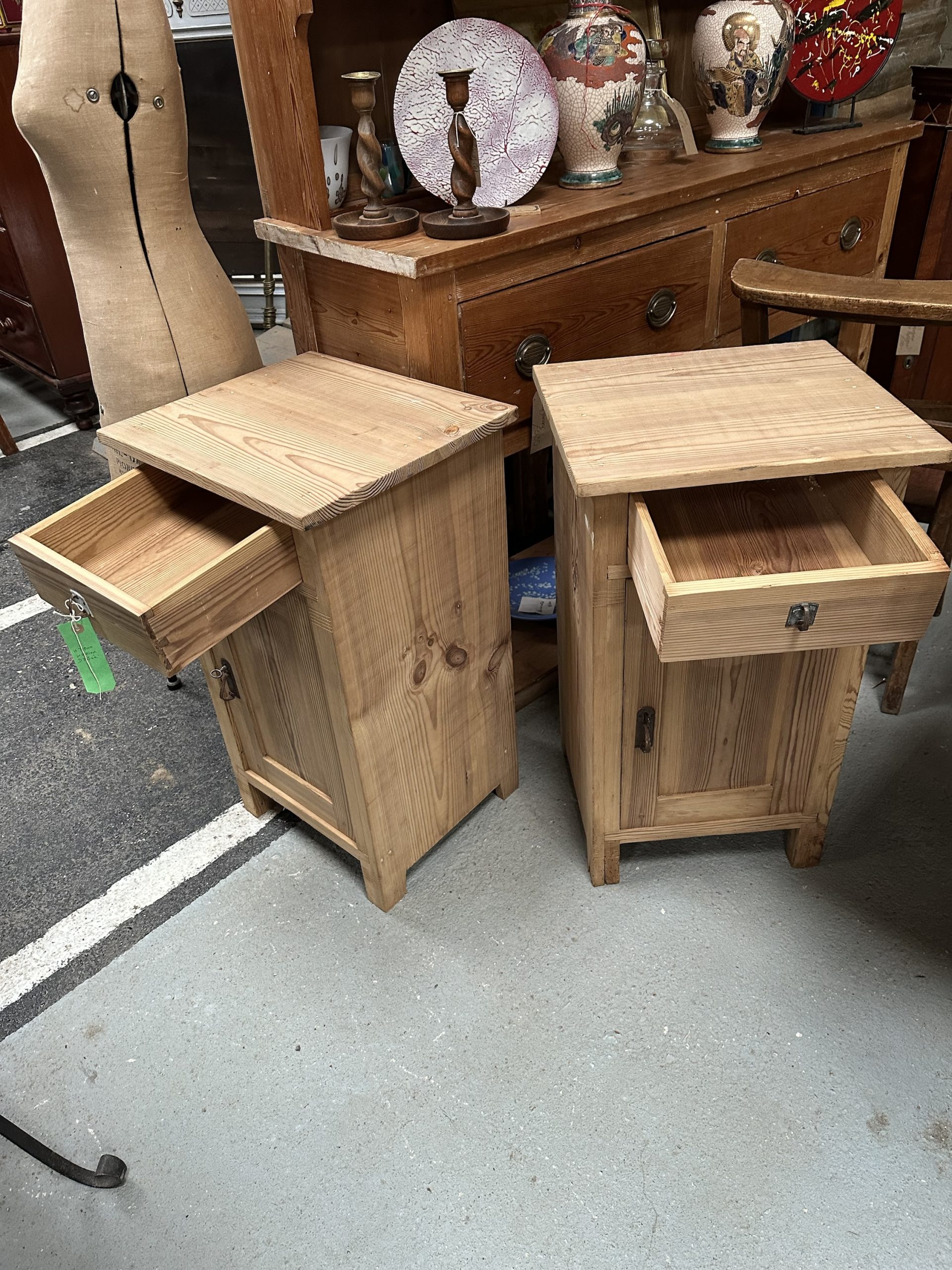 Product EnquiryA pair of old stripped pine beside tables with drawer and internal shelving. Both hinged to the right.