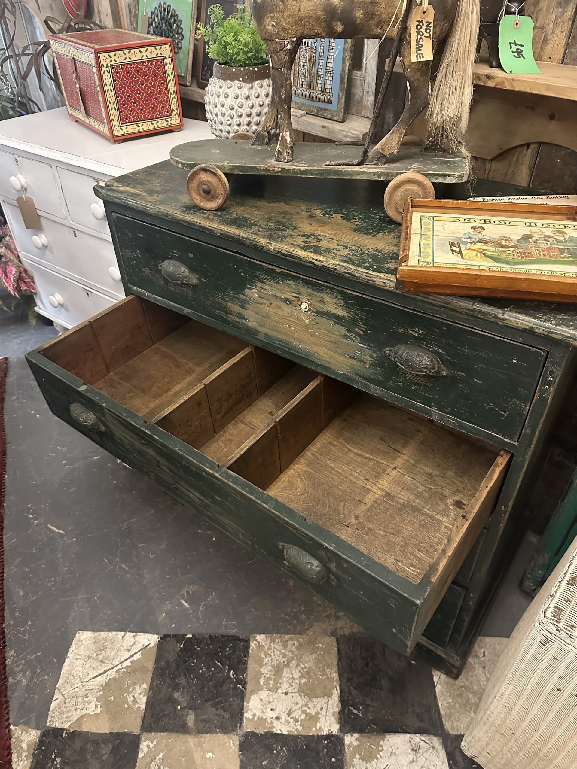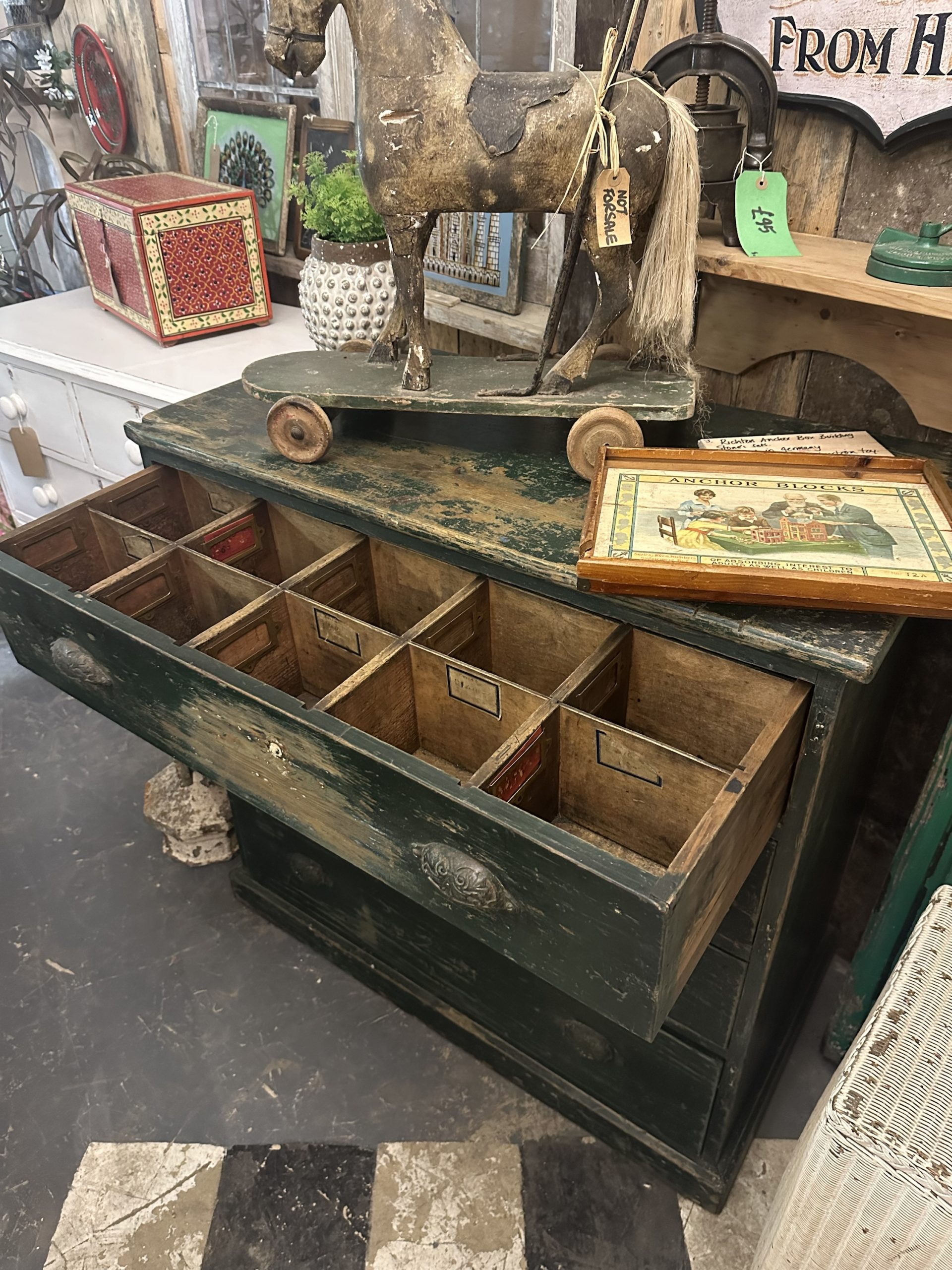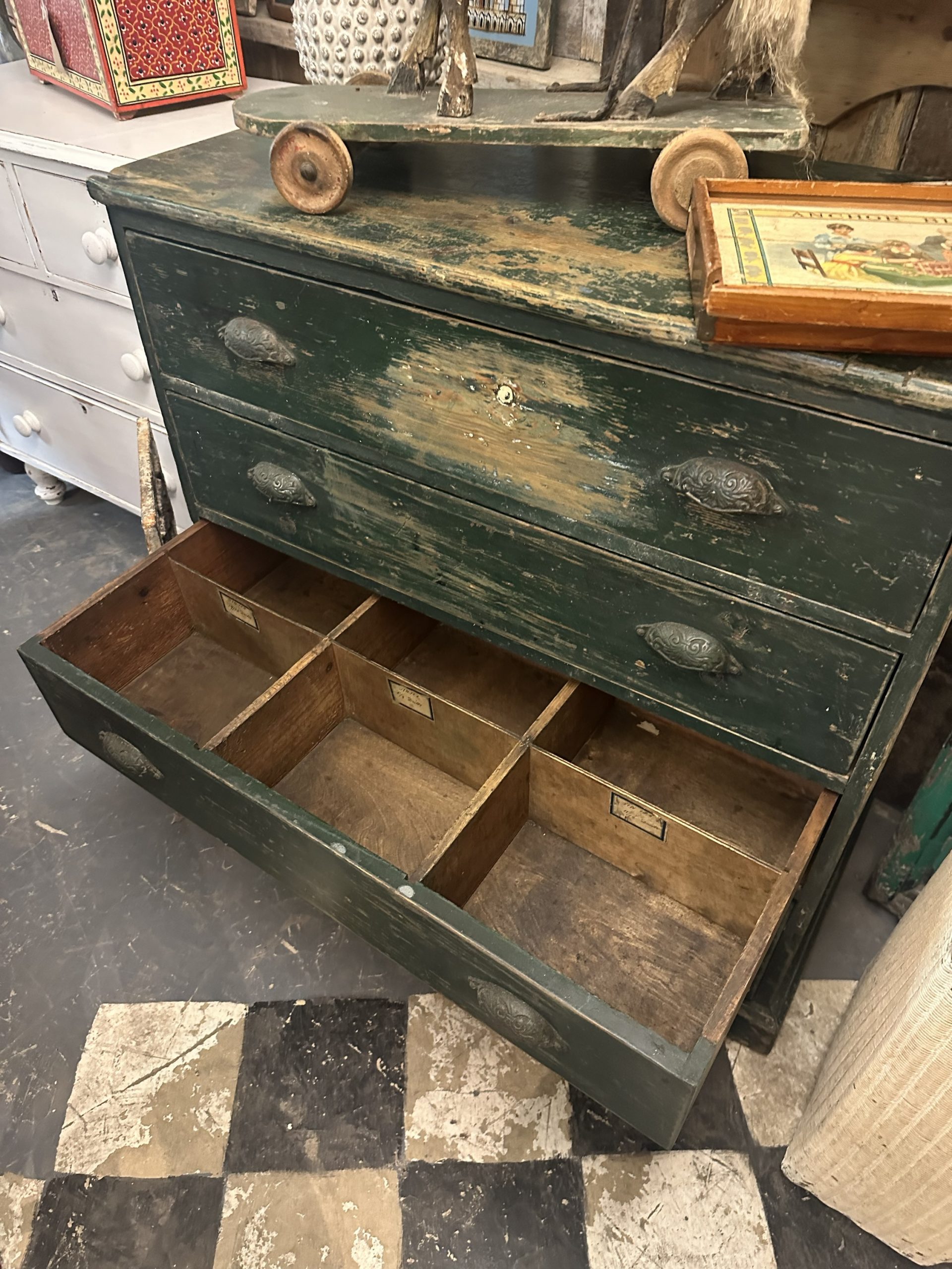 Shabby green chest of drawers with a variety of compartments.