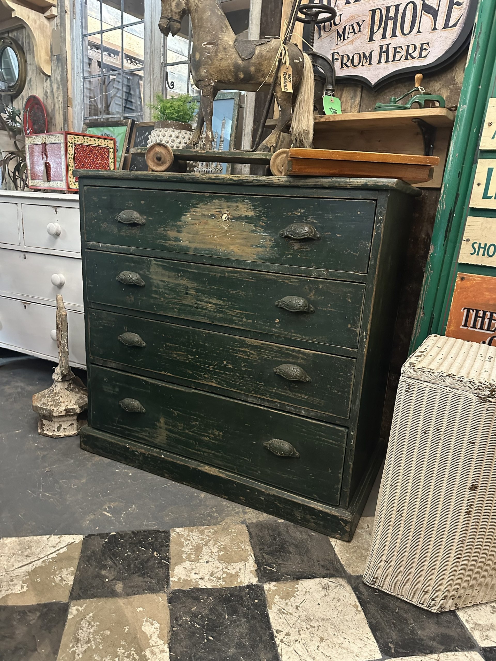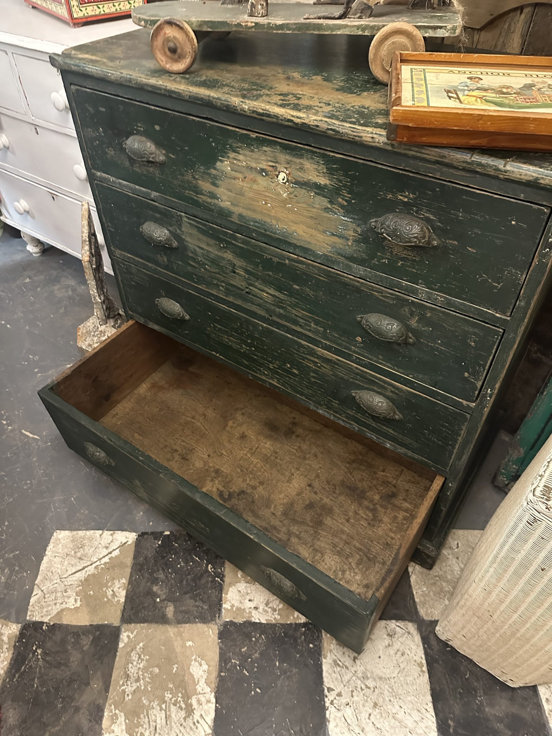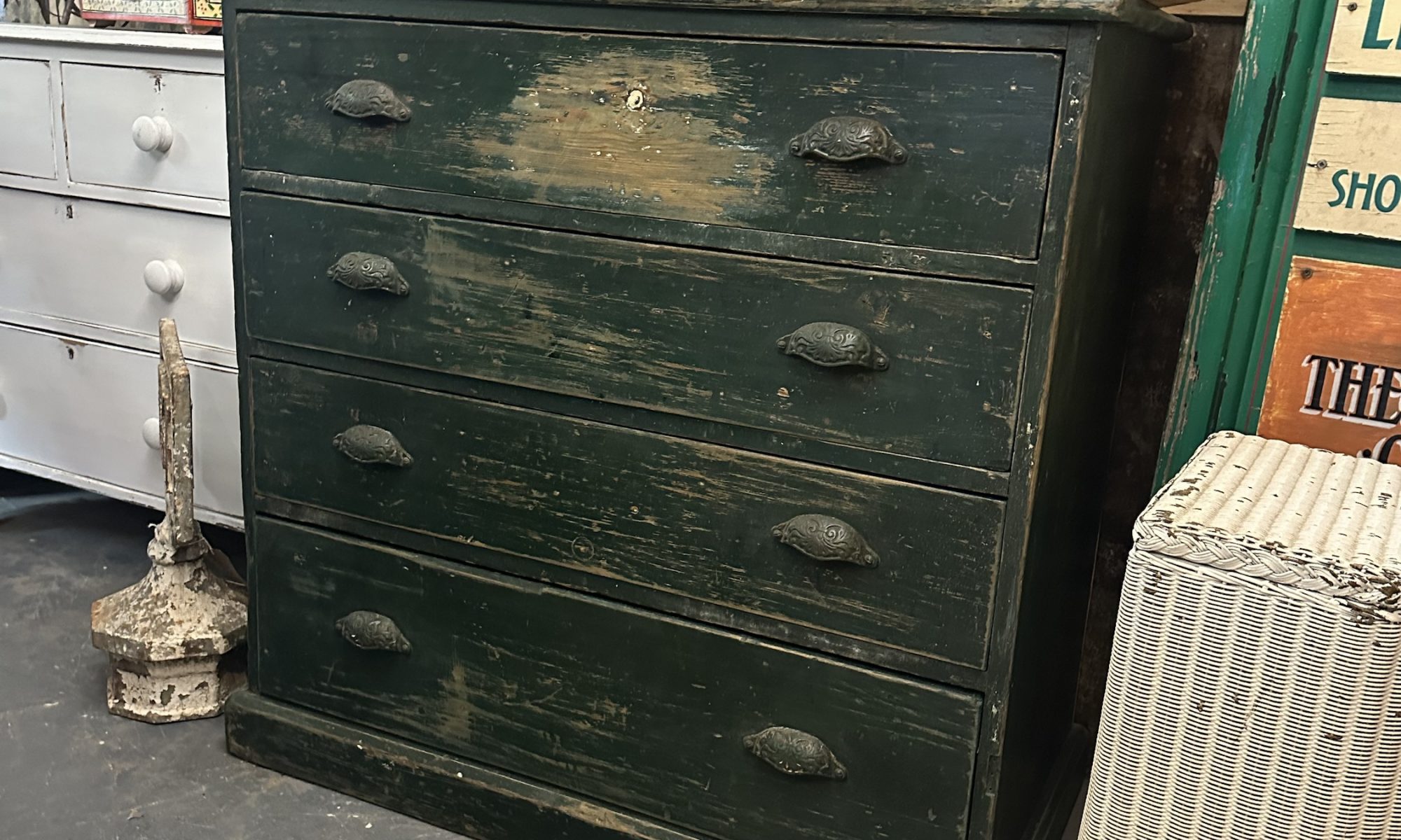 Shabby green chest of drawers with a variety of compartments.