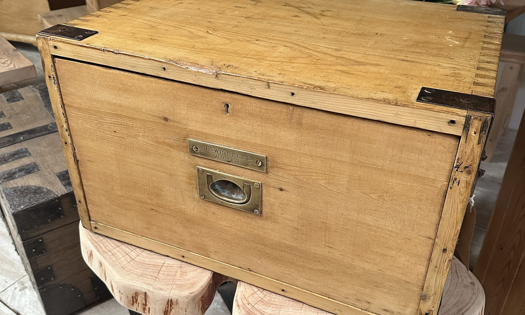 Dove tailed detail on the top with metal reinforcement and heavy handles to the side.