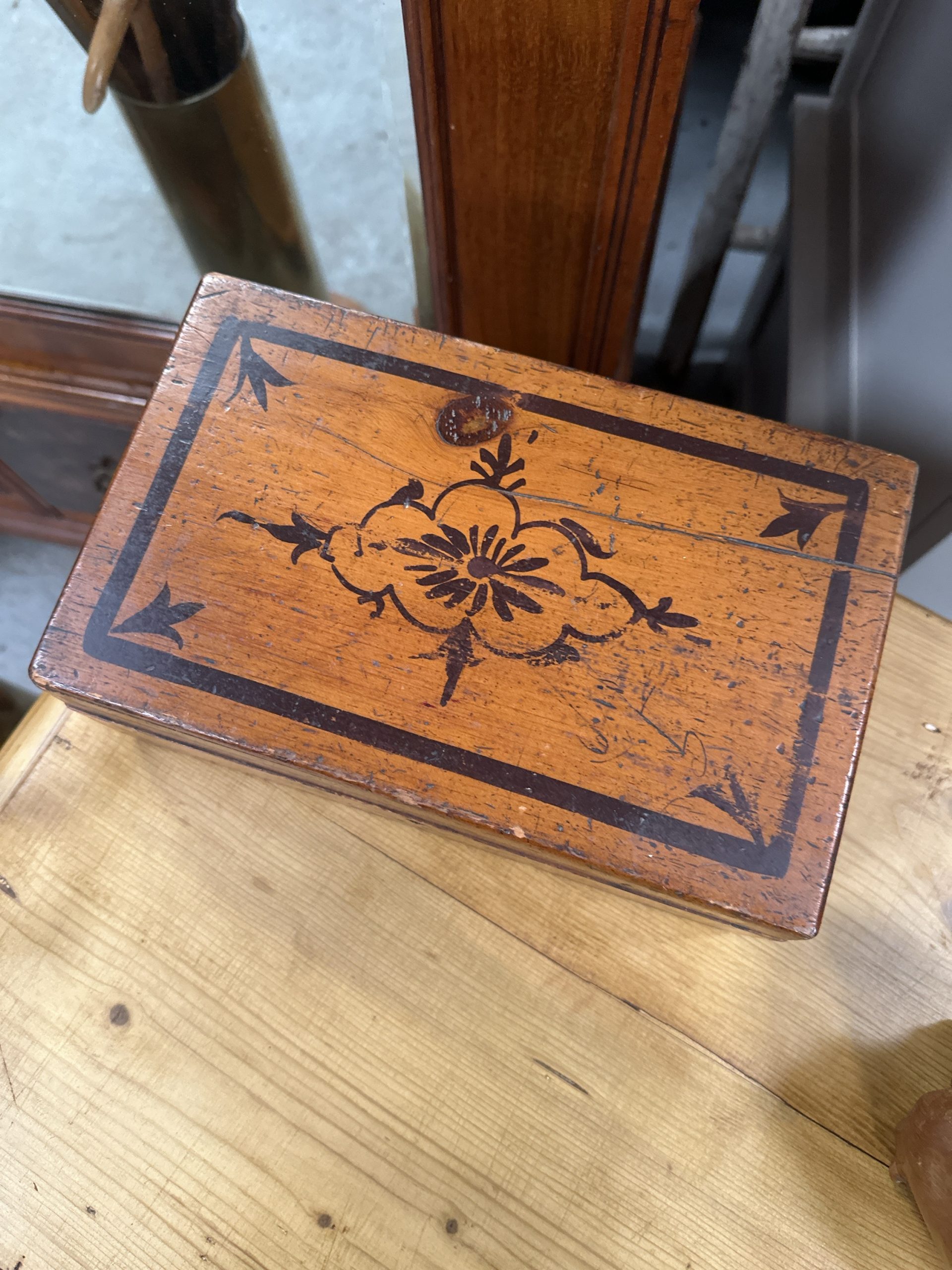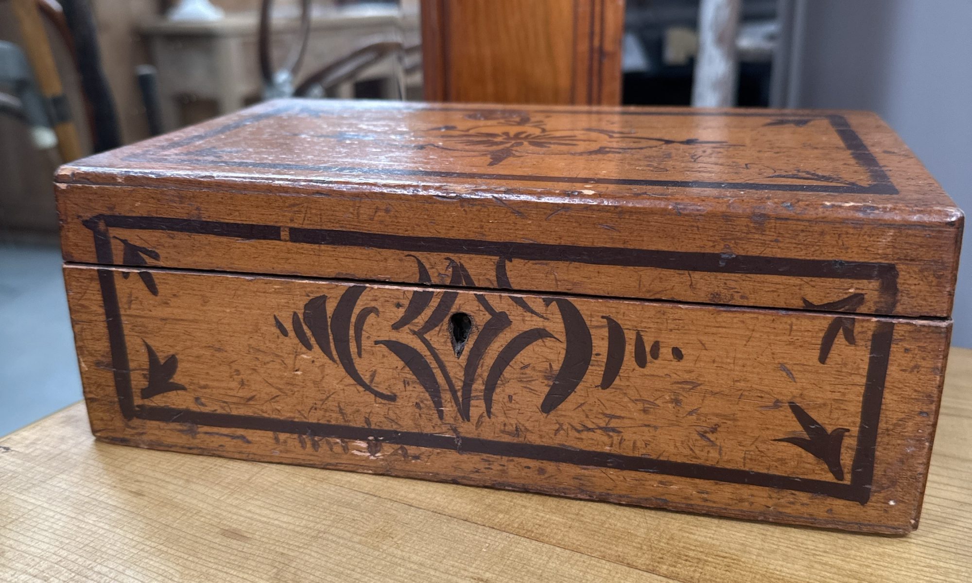 Small antique pine box with paper lined interior and painted decoration on front and lid.