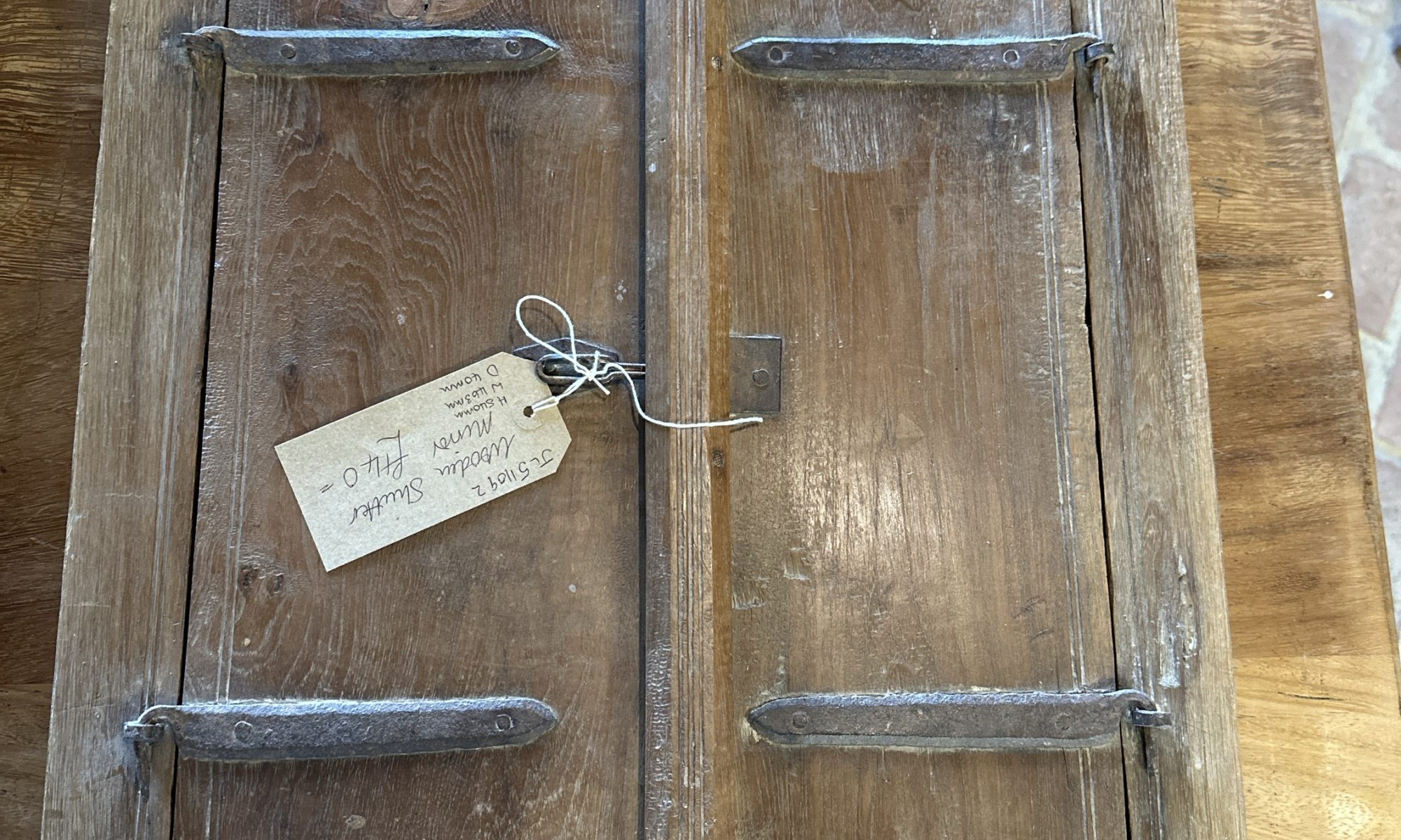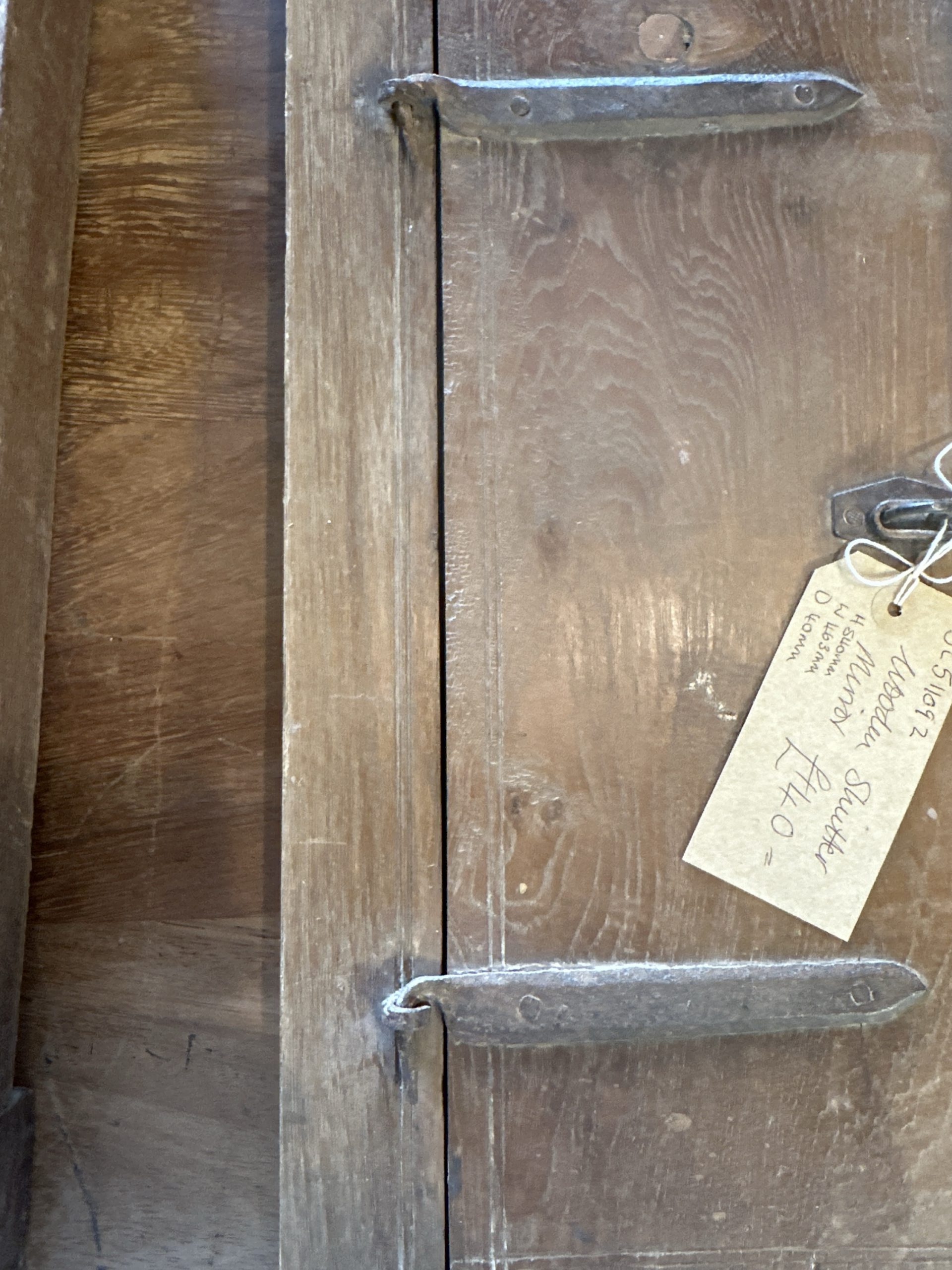 Small wooden shutter mirror with removable shutters, decorative centre bar and wooden catch at the top.