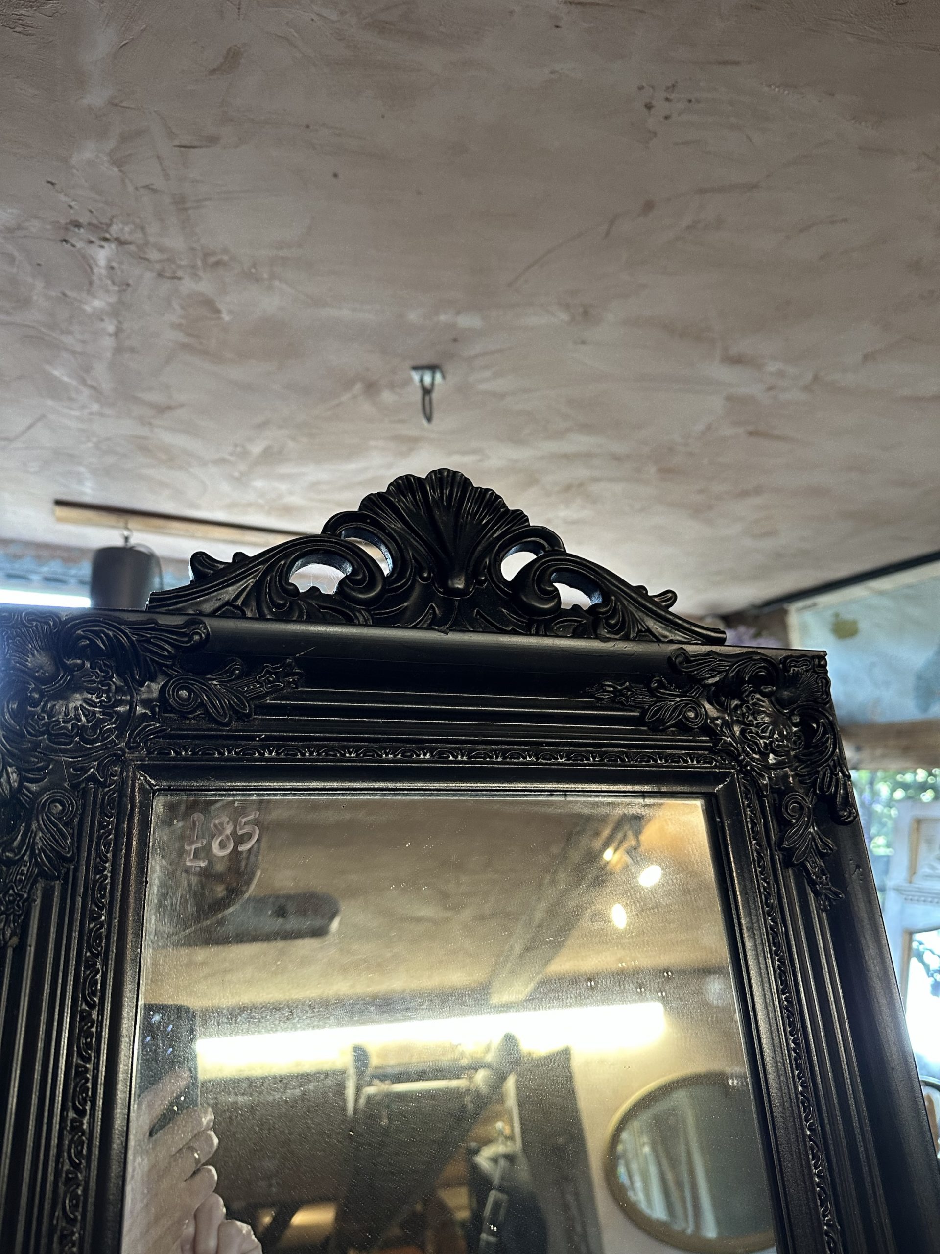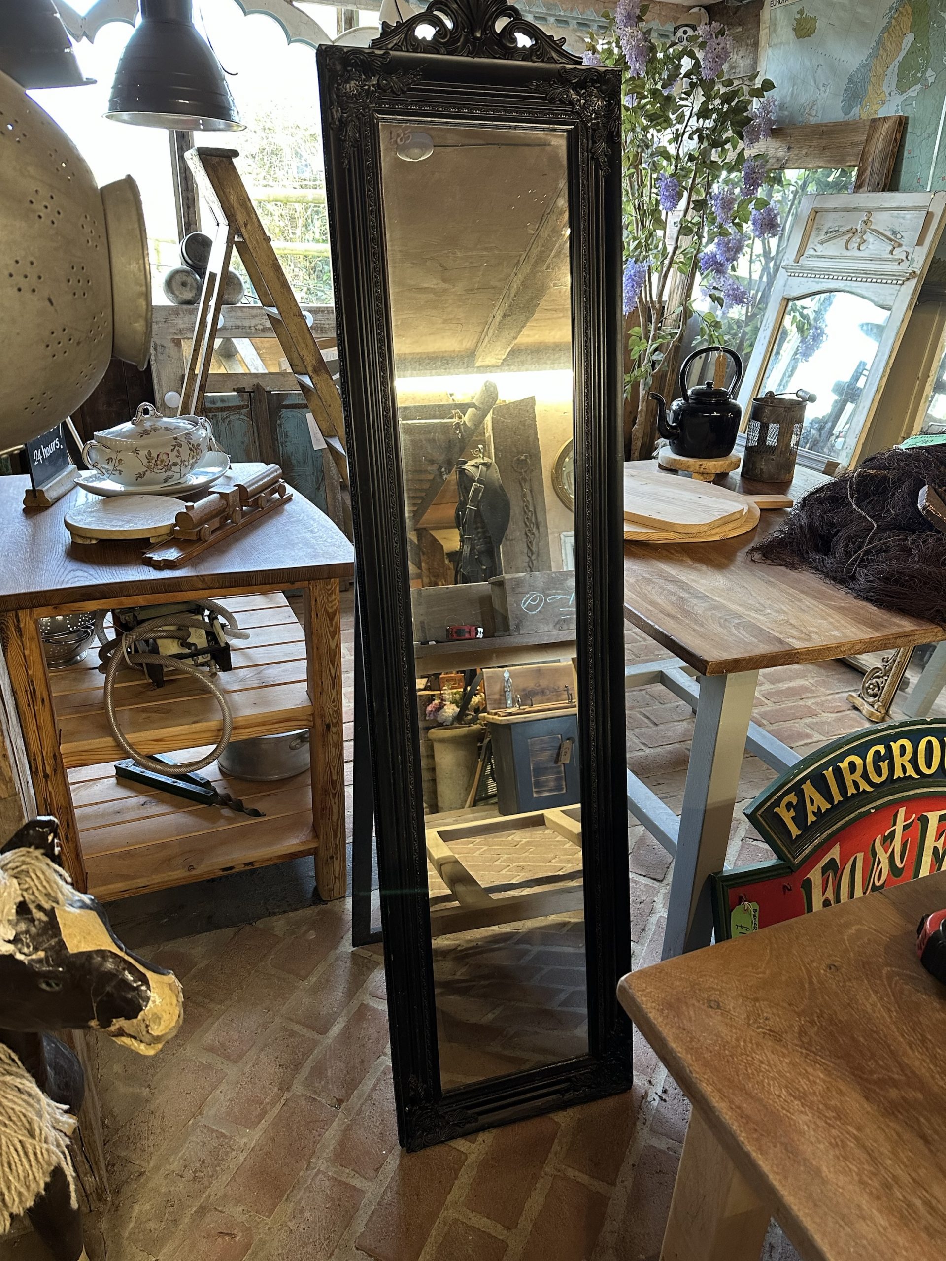 Black, tall, freestanding mirror, could be wall hung with the stand removed.
