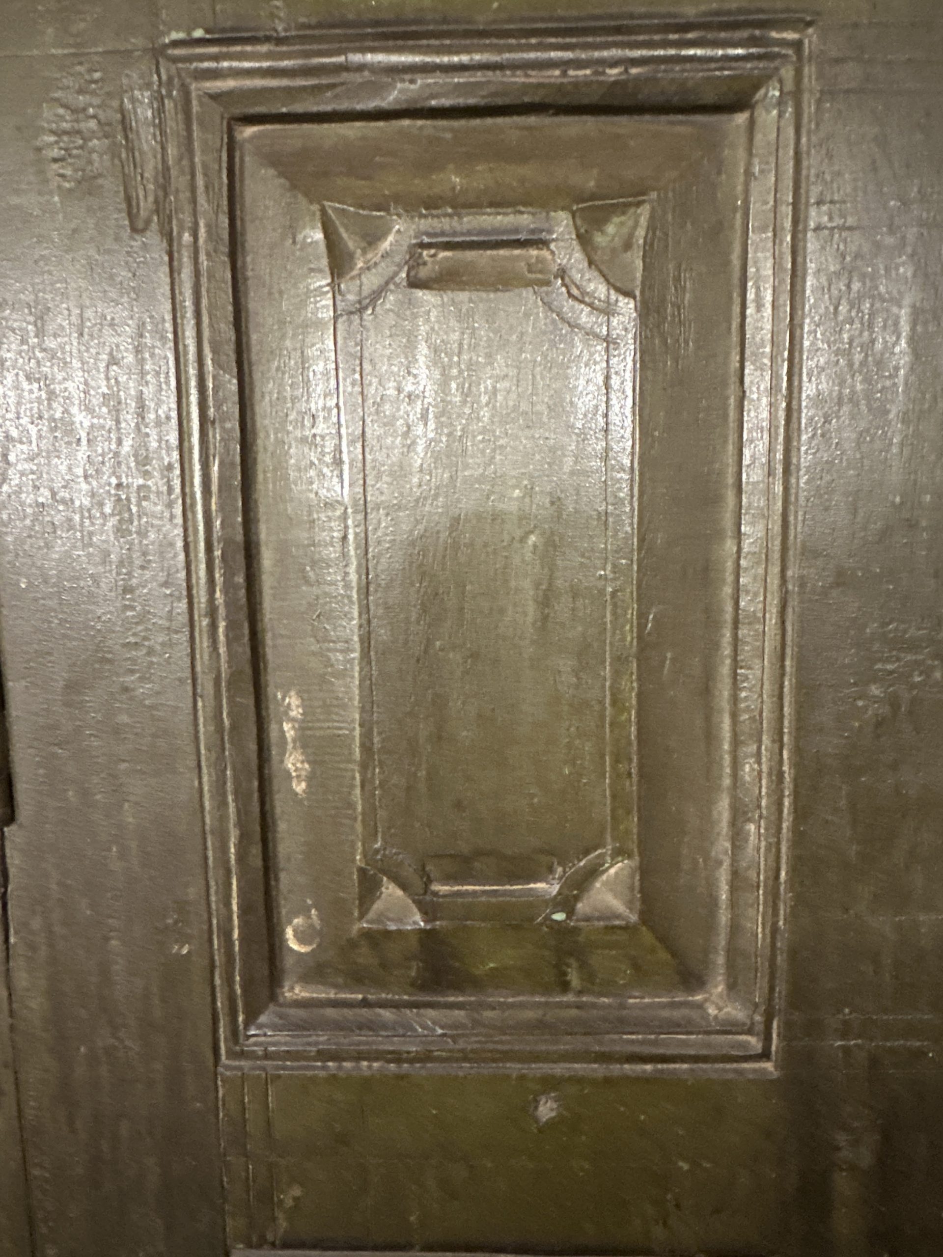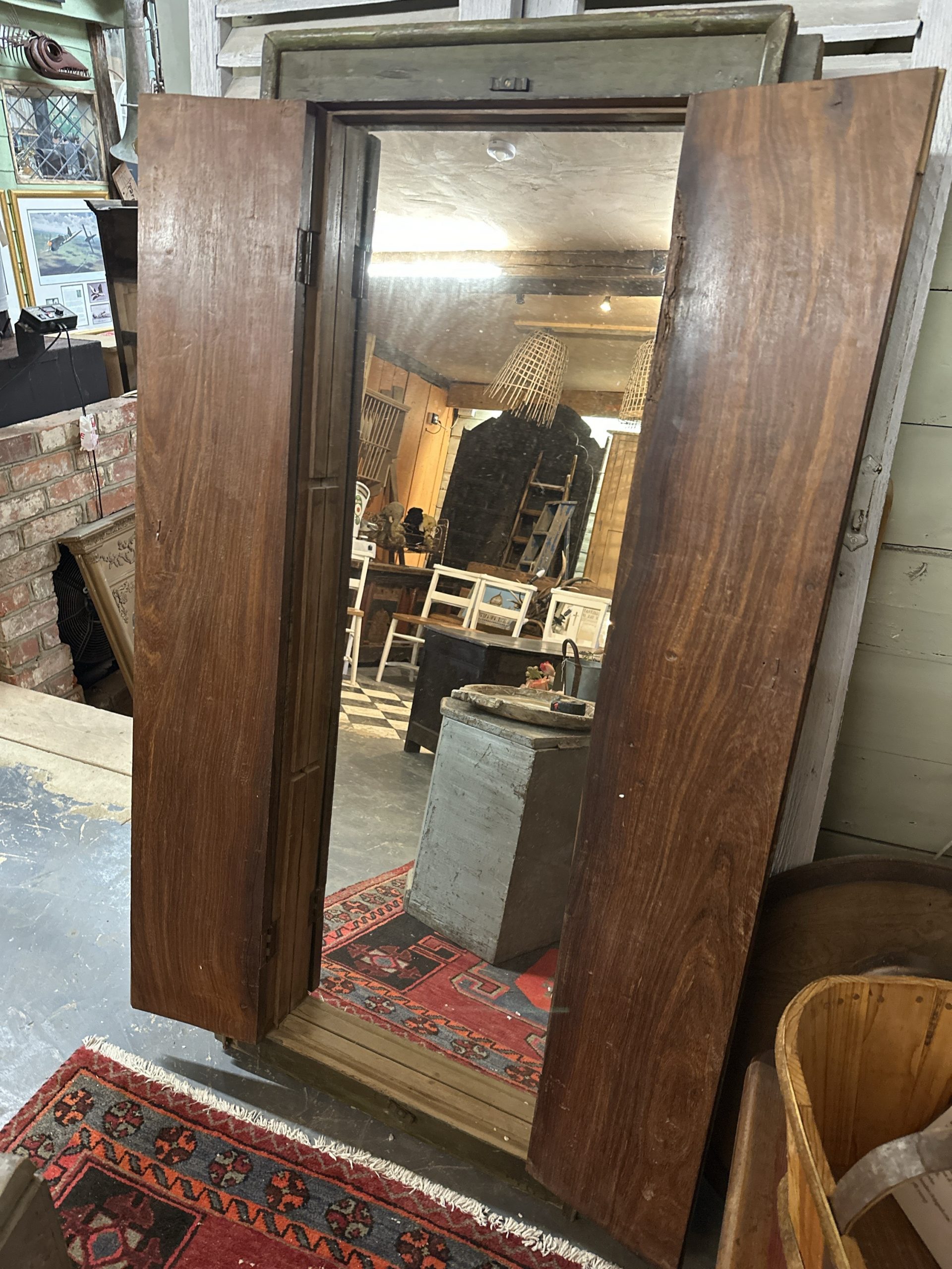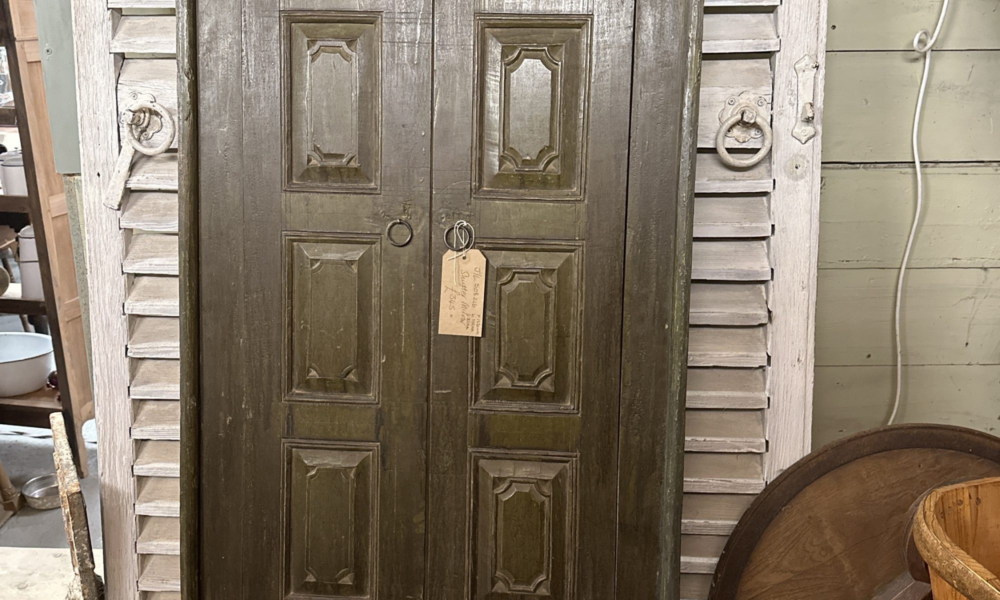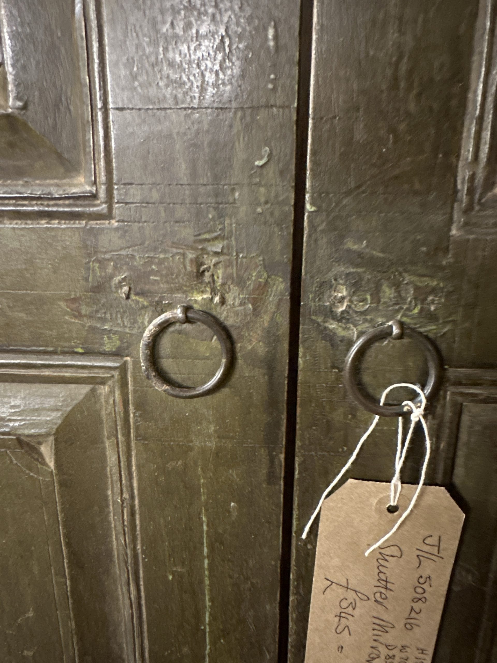 Catches at top and bottom of shutters to hold closed, two ring handles.
