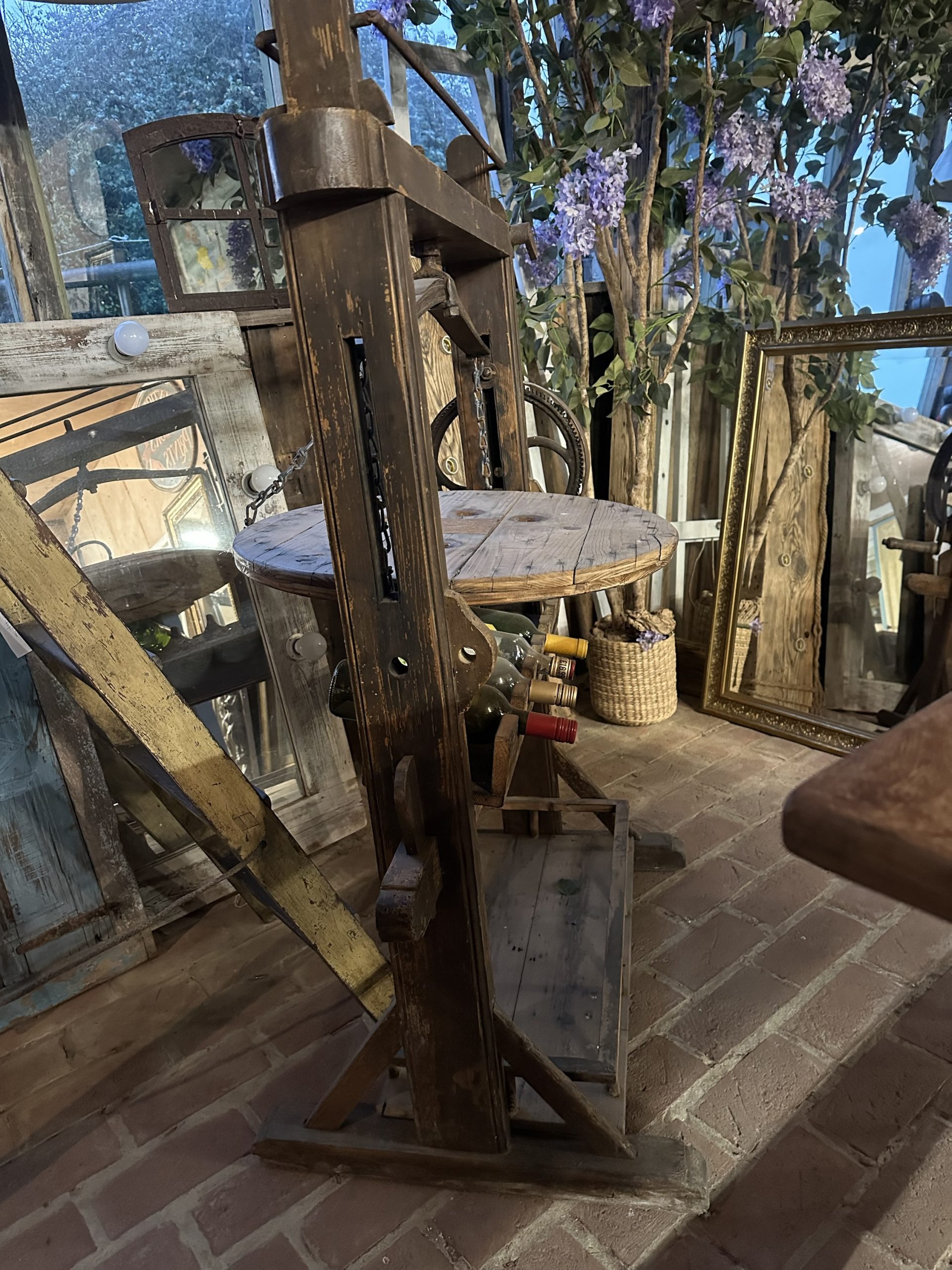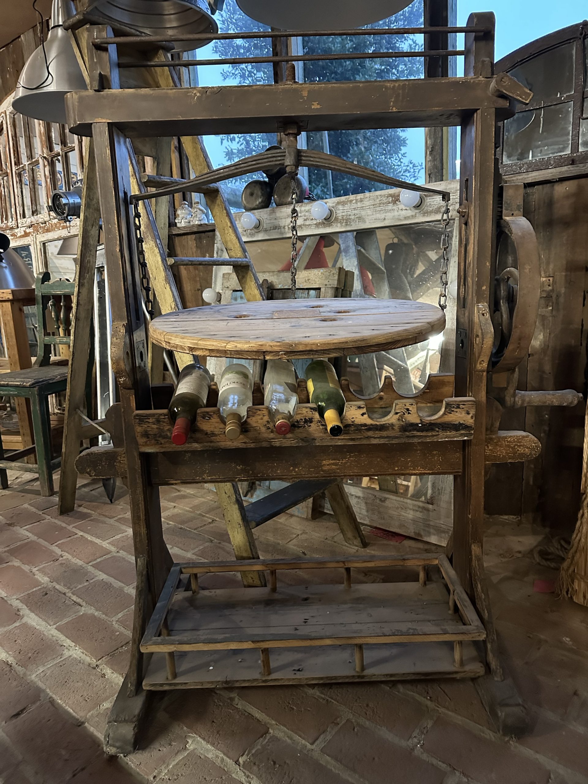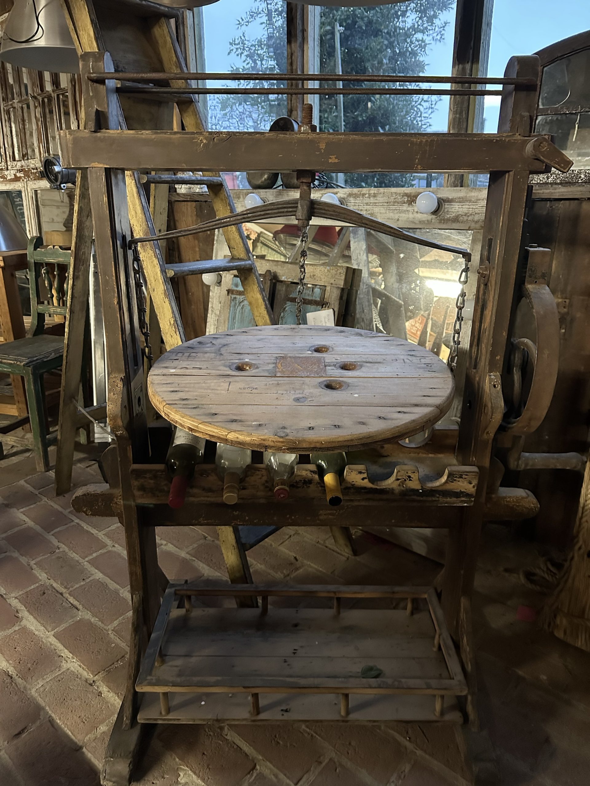 Unusual styled wine rack using the outer frame of a mangle with balanced serving shelf and wine bottle storage under. Space at the bottom for extra bottles or cooled beer.