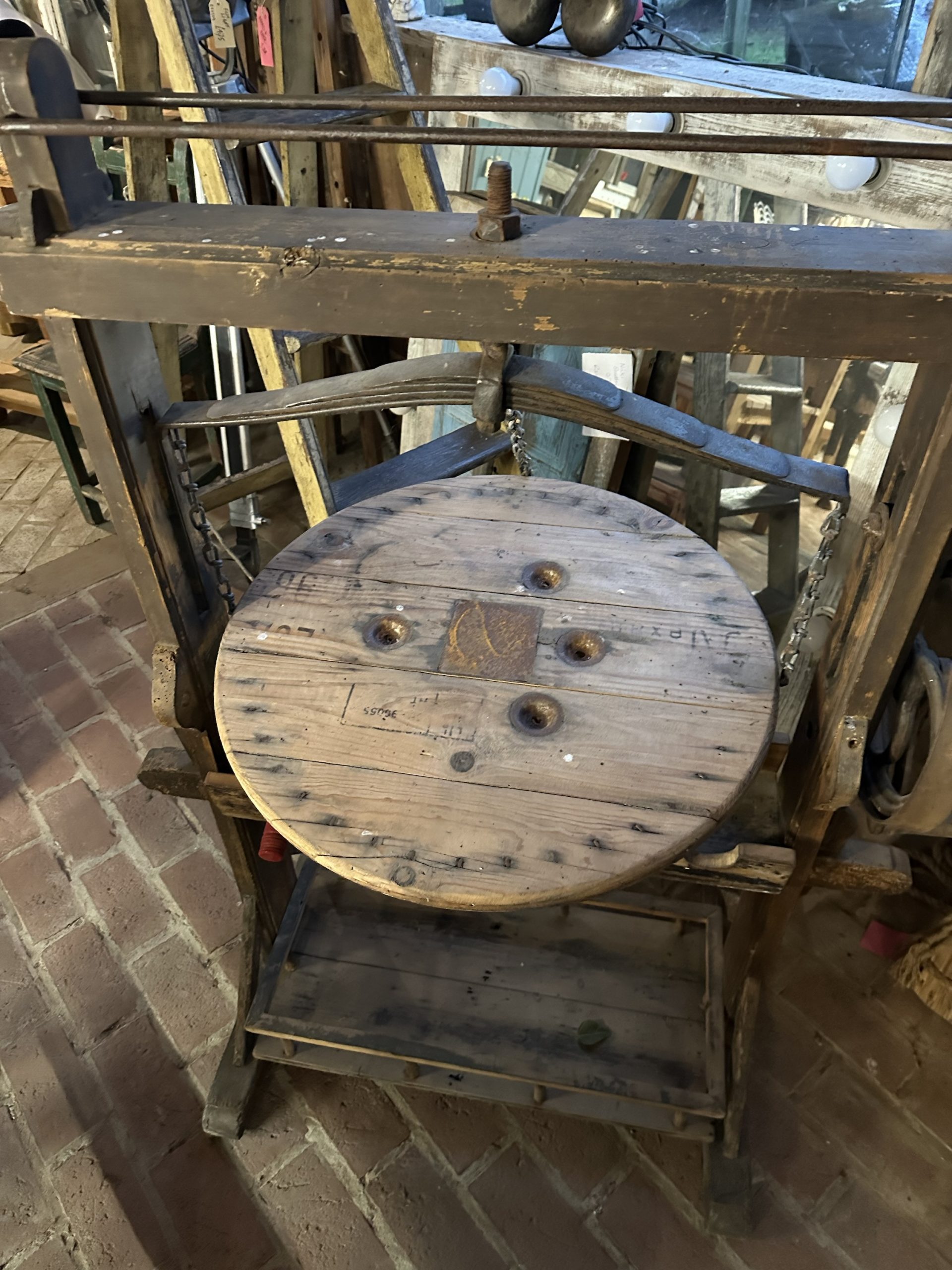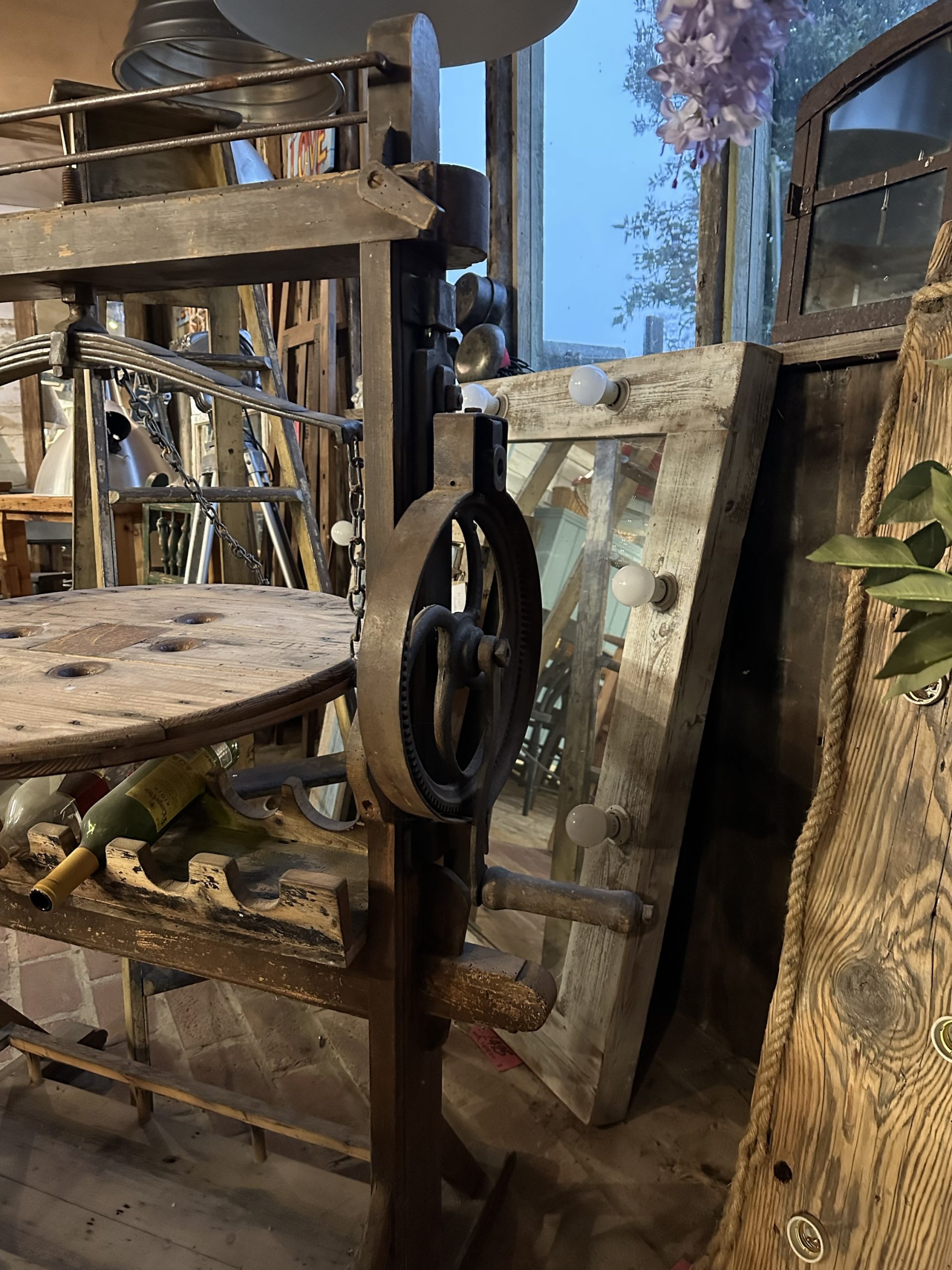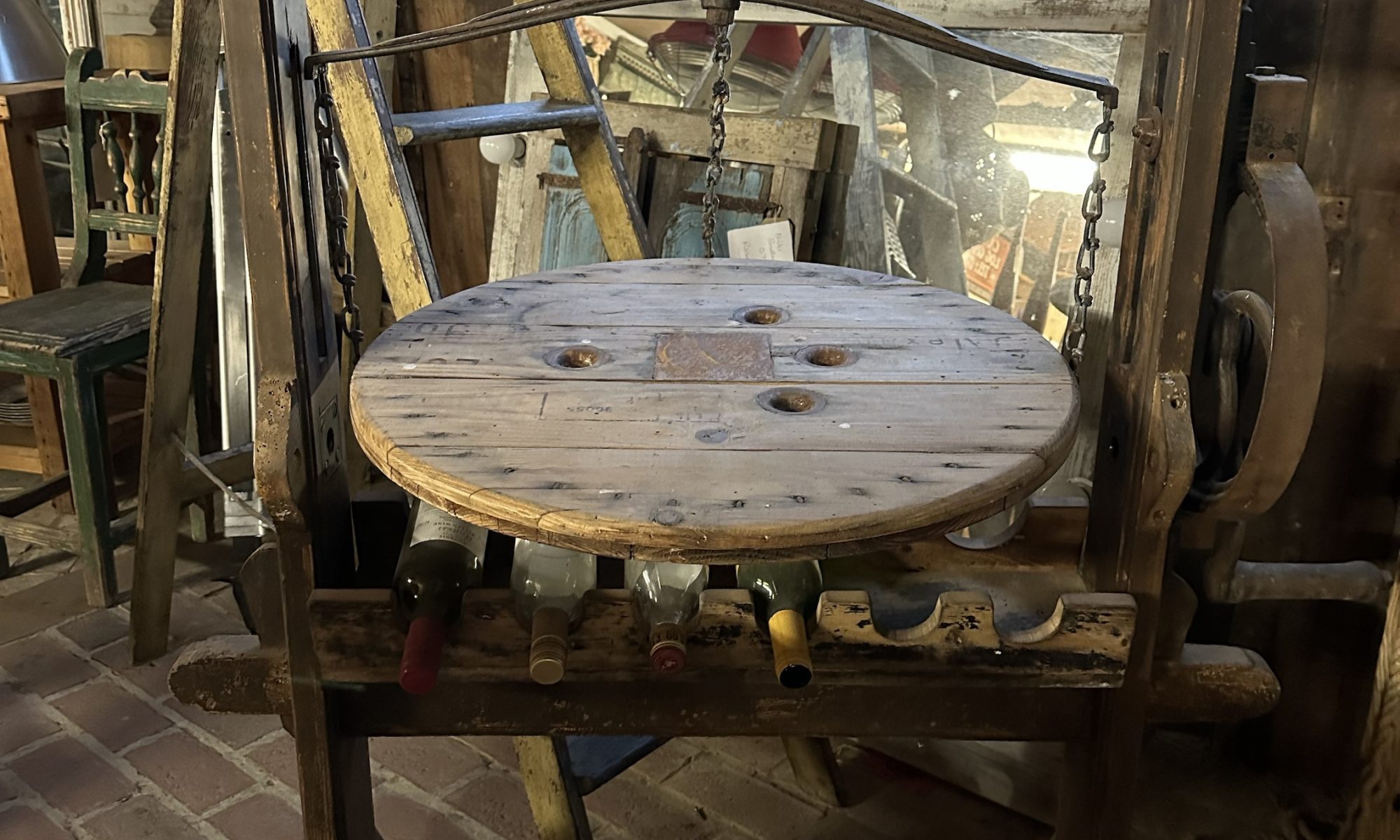 Unusual styled wine rack using the outer frame of a mangle with balanced serving shelf and wine bottle storage under. Space at the bottom for extra bottles or cooled beer.